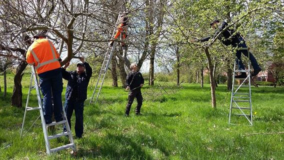 De tien cursisten namen samen vijf fruitboomgaarden in de gemeente Groningen onder handen. De deskundige begeleider van Landschapsbeheer Groningen leerde ze de fijne kneepjes van het snoeien van fruitbomen.
