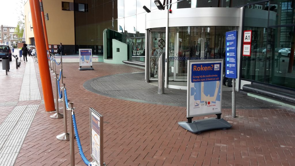 Het UMCG stelde eind vorig jaar een algeheel rookverbod in bij de hoofdingang. Dat werd slecht nageleefd en nauwelijks gehandhaafd. Na het plaatsen van extra borden en een nieuwe opzichtige afzetting lijkt het nu beter te gaan.