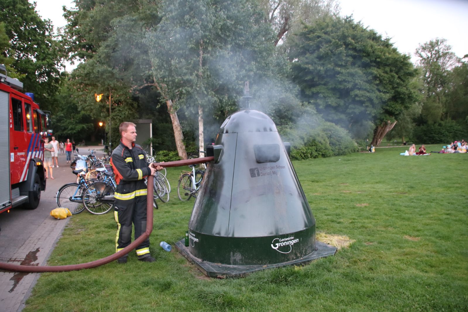 In het Noorderplantsoen bij de Oranjesingel stond vanavond korte tijd een afvalcontainer in brand. Omdat het druk was in het plantsoen trok het brandje veel bekijks.