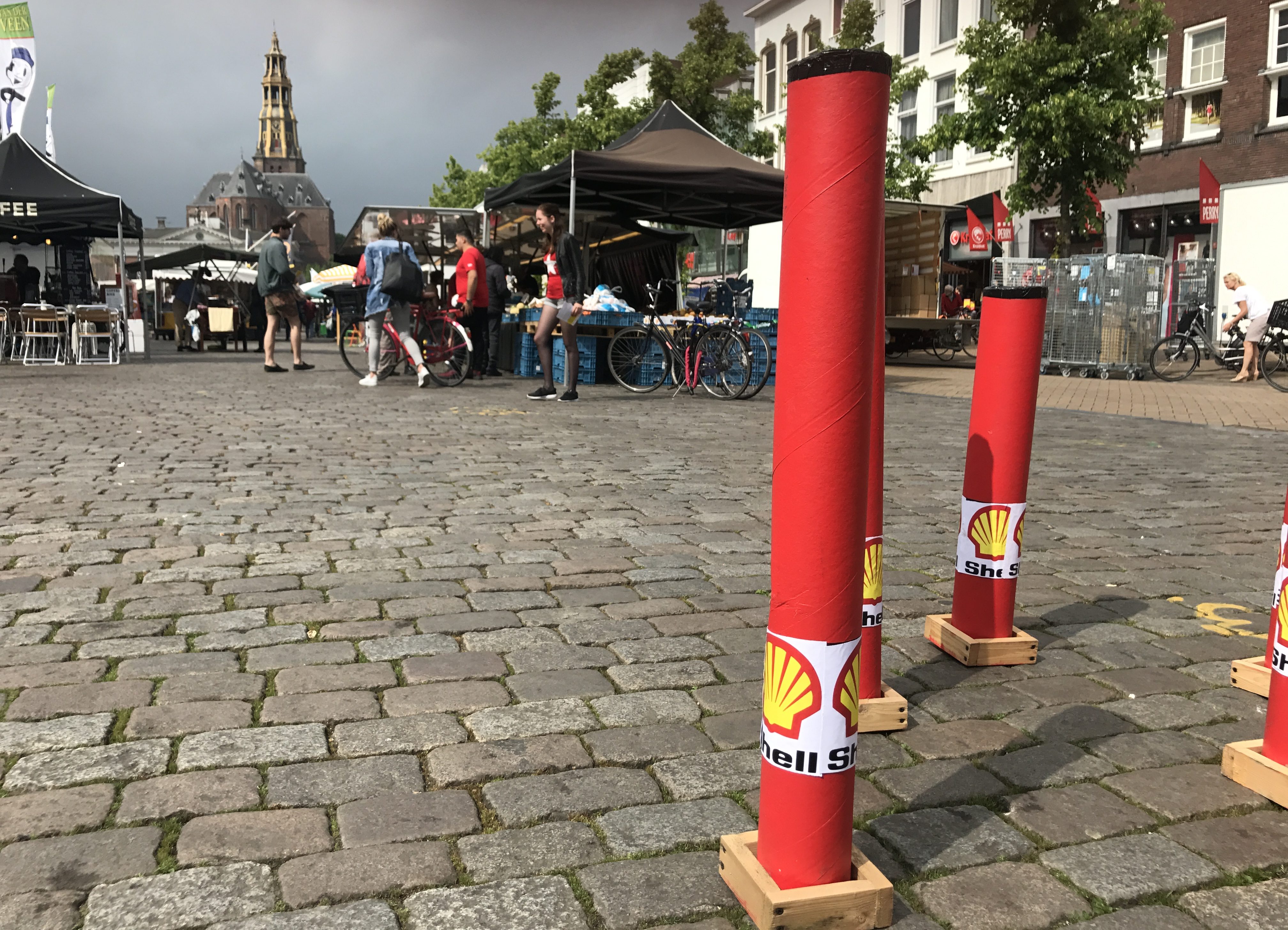 Kegelen tegen Shell, dat kon dinsdagochtend op de Vismarkt. ROOD Groningen, de jongeren van de SP, protesteren op die manier tegen de vervuiling die grote bedrijven uitstoten, zoals de Shell