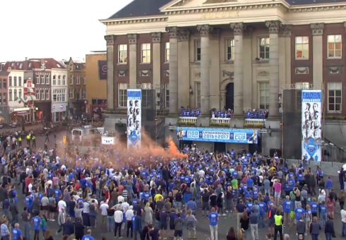 De Grote Markt kleurde vrijdagavond Donar-blauw tijdens de huldiging van de Groninger basketballers. Donar prolongeerde donderdag ten koste van Landstede de landstitel.