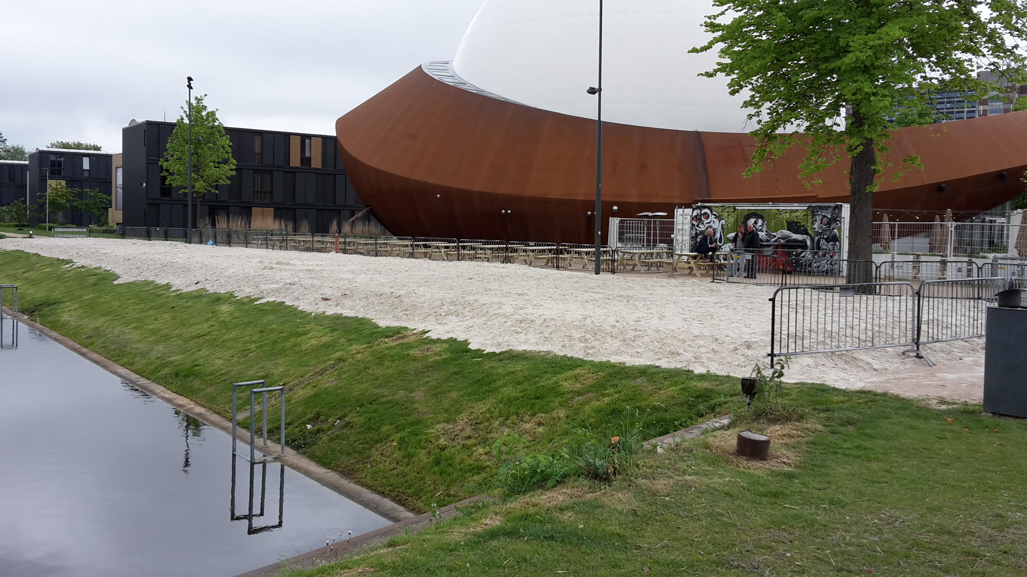 Het stadsstrand bij DOT, het voormalige Infoversum op het Ebbingekwartier, is woensdag klaar gemaakt voor het nieuwe zomerseizoen. Door het mooie weer werd er direct volop gebruik van gemaakt.