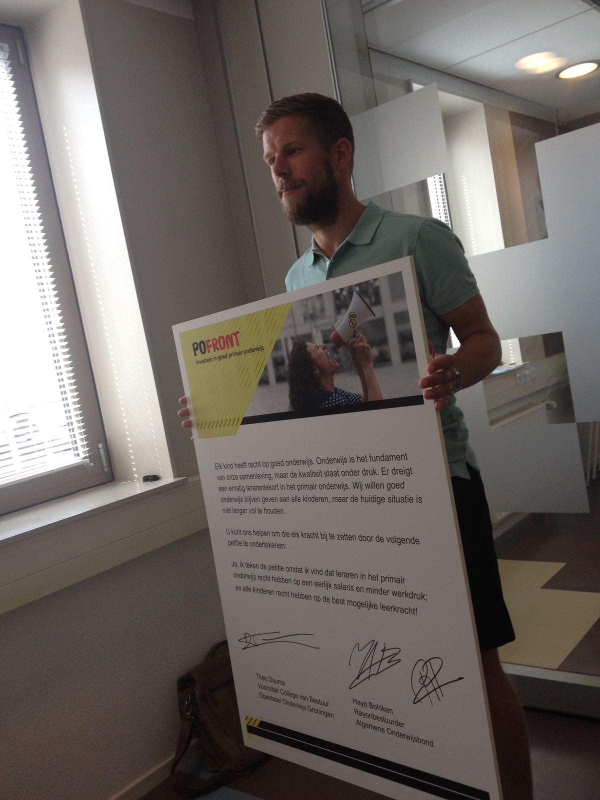 College voorzitter Theo Douma en Hayo Bohlken van de Algemene Onderwijsbond ondertekenden een manifest waarin duidelijk gemaakt wordt dat de werkdruk van docenten in het Primaire Onderwijs moet afnemen en het salaris moet toenemen.