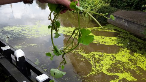 In de sluis bij de Eelderbrug in de Zuiderhaven wijst hij een drijvende plak grote waternavel aan. “Kijk, vorige week zag ik hier een paar kleine stukjes drijven. Nu de temperatuur van het water oploopt groeit dit plantje explosief. De verschillende beheerders zoals de provincie, de gemeente en het waterschap houden de groei goed in de gaten. Dat is echt nodig want anders groeien onze watergangen snel dicht”, vervolgt hij.