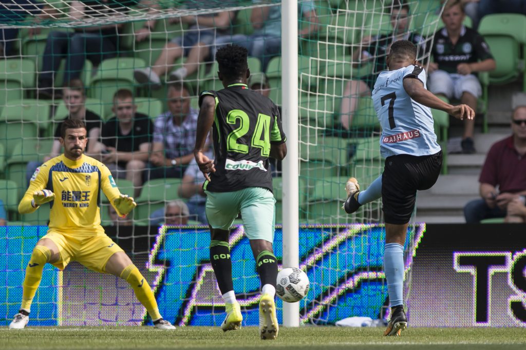 Foto: Sportphotoagency.com Juninho Bacuna van FC Groningen schiet in.