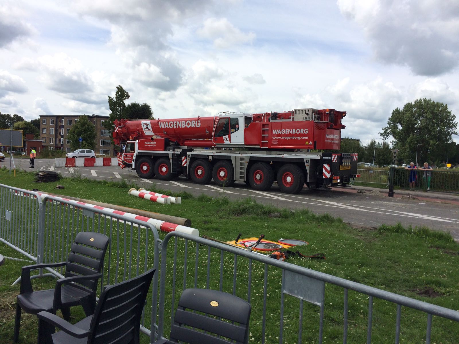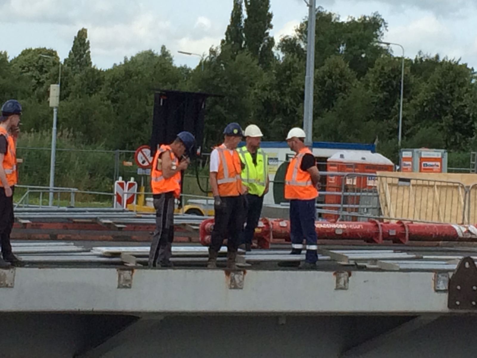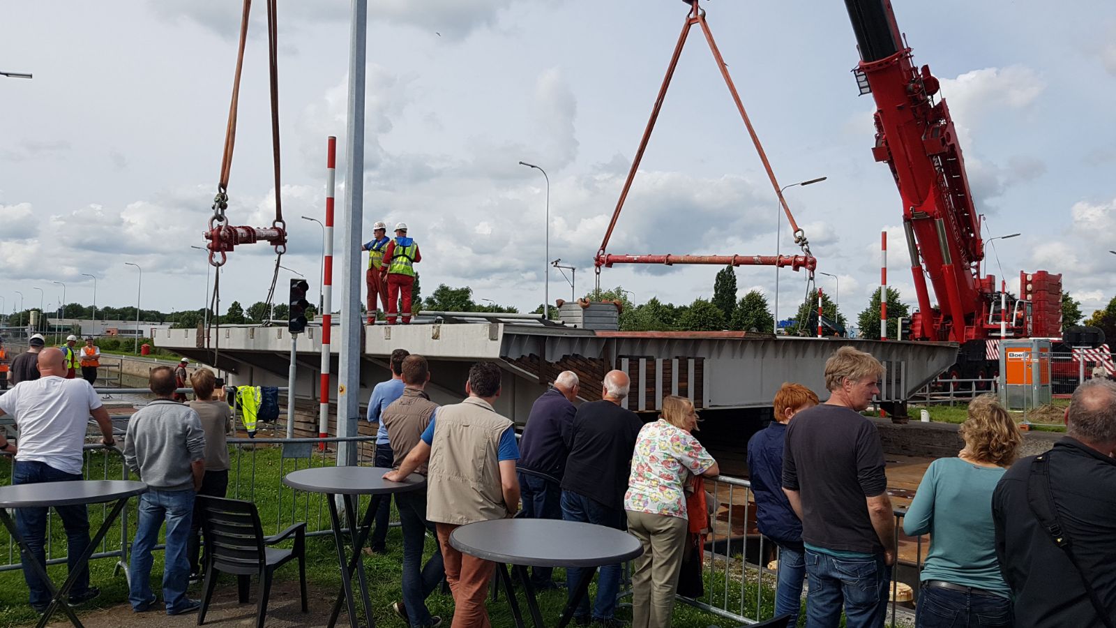 Het verwijderen van de brug kan op flink wat belangstelling rekenen. “We hebben een prima uitzicht op wat er gebeurt”, aldus één van de toeschouwers. “En we worden ook flink in de watten gelegd met koffie, thee, ranja en cake. Heel leuk!”