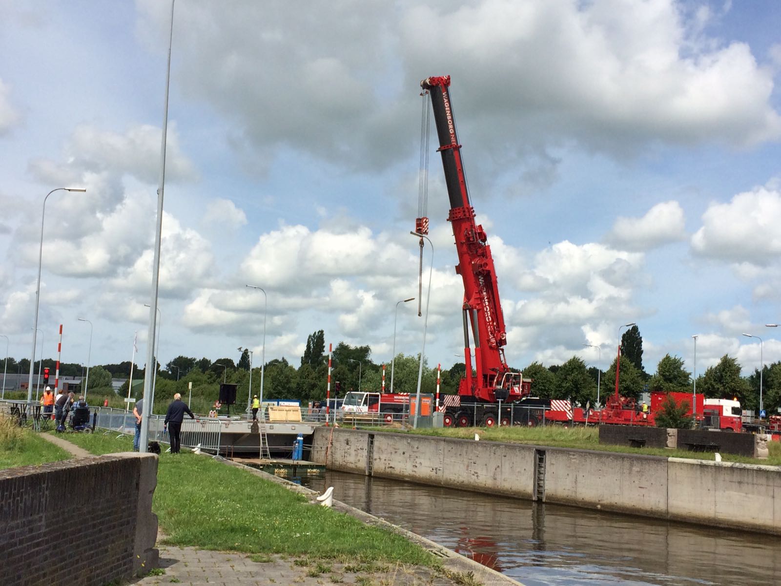 Het verwijderen van de brug kan op flink wat belangstelling rekenen. “We hebben een prima uitzicht op wat er gebeurt”, aldus één van de toeschouwers. “En we worden ook flink in de watten gelegd met koffie, thee, ranja en cake. Heel leuk!”