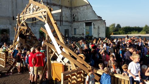 “Wij zijn met z’n vijven en kennen elkaar van de voetbalclub. Nu bouwen we een hut van drie bij drie meter en deze wordt sowieso twee hoog. We noemen onszelf Bob de Bouwers”, vertelt Pelle die ondertussen druk doorgaat met timmeren en de anderen instructies geeft.