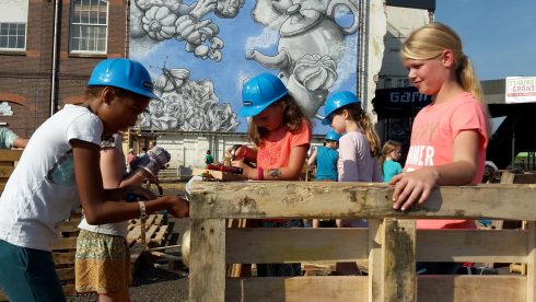 Sommige kids hadden een goed gevulde gereedschapskist bij zich. Anderen pakten een emmer, beschikbaar gesteld door een sponsor, met werkhandschoenen, een meetlint en een bouwhelm speciaal voor kinderen. Na het ophalen van het verplichte polsbandje gingen ze aan de slag.