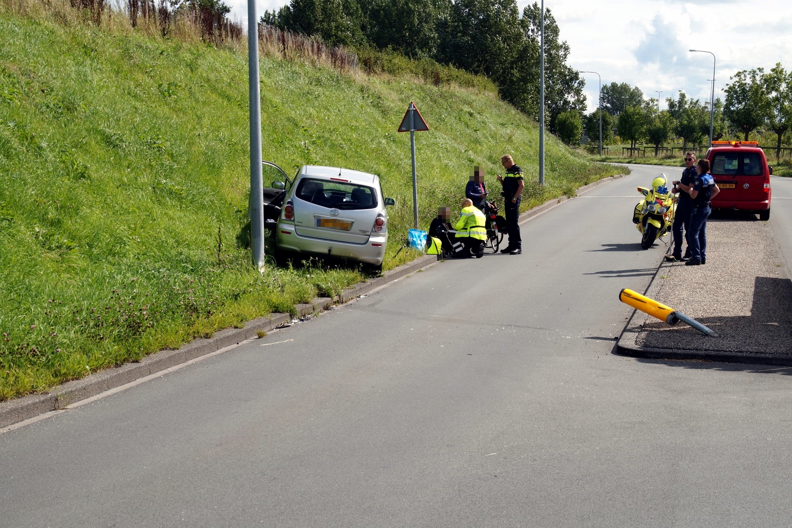 Door nog onbekende oorzaak raakte hi de controle over het stuur kwijt. De auto ramde een vluchtheuvel en kwam vervolgens tegen een geluidswal tot stilstand. Agenten en de bestuurder van een motorambulance verleenden eerste hulp.