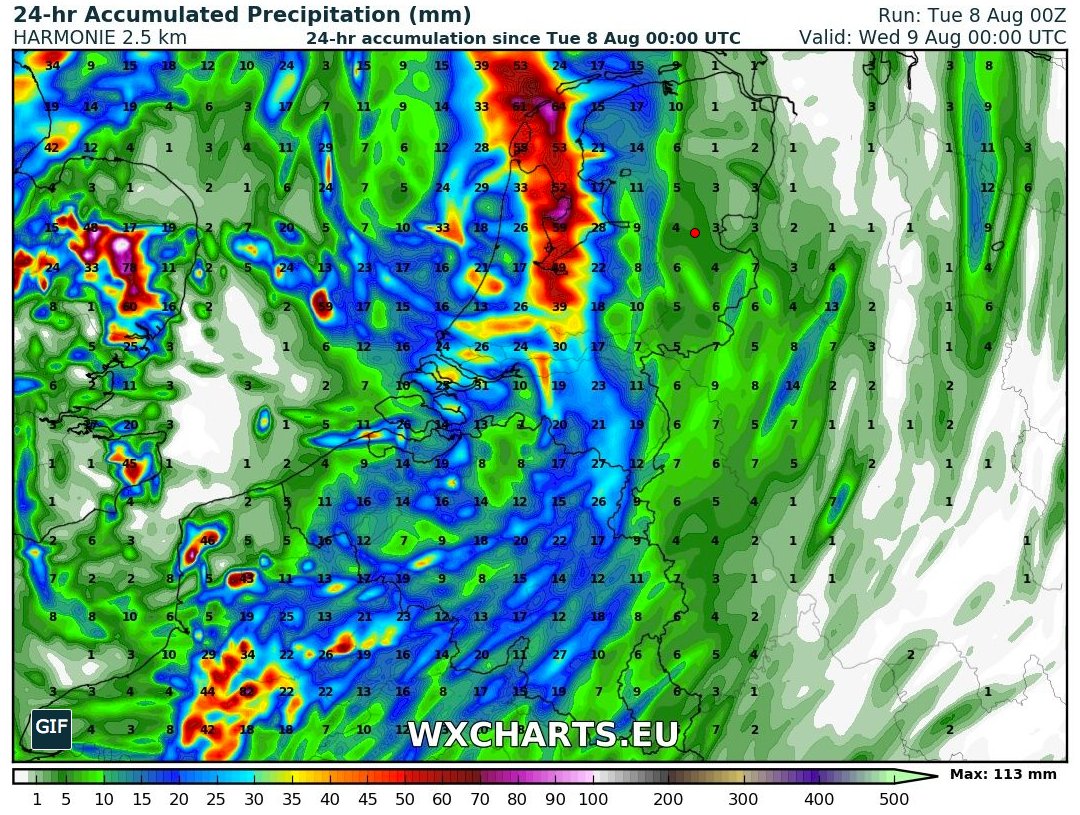 Het KNMI weermodel Harmonie voorspelt voor Noord Nederland later vandaag tot wel 30 mm. regen. Dat is 30 liter water per vierkante meter.