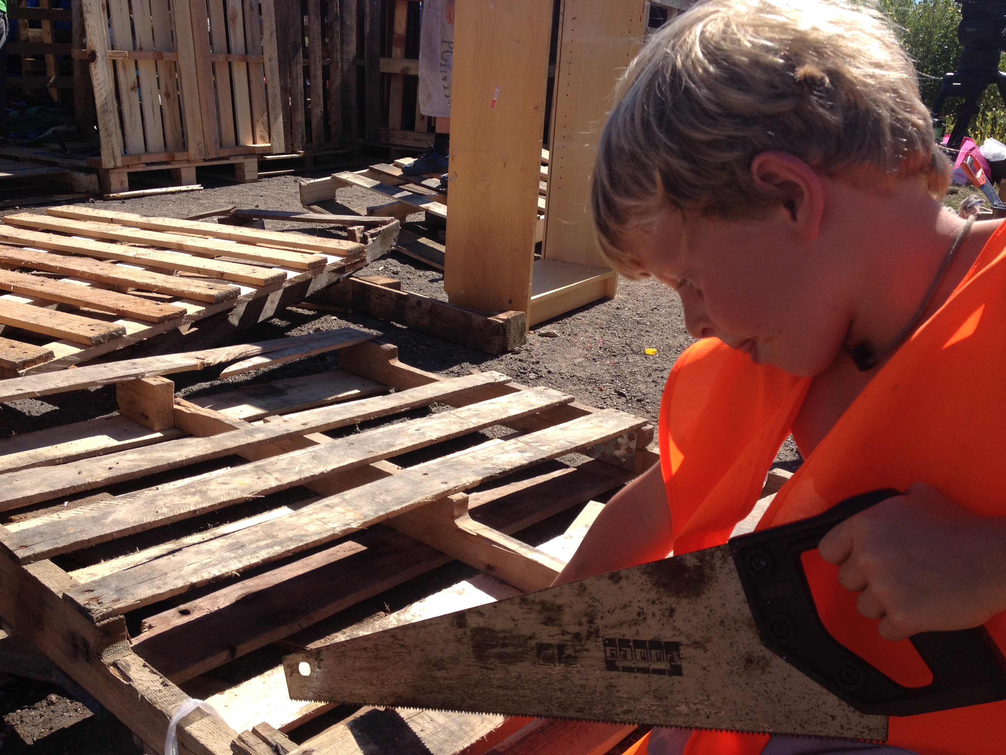 Woensdag is begonnen met de bouw en op de tweede dag zijn zo’n dertig kinderen druk in de weer met spijkers en hamers. “Wij bouwen een hut die gewoon op een huisje moet lijken”, zegt Xummer. “Maar het is nog niet helemaal af. We willen het nog wat kleurtjes met graffiti geven, en er moeten nog wat dingen versiert worden.”