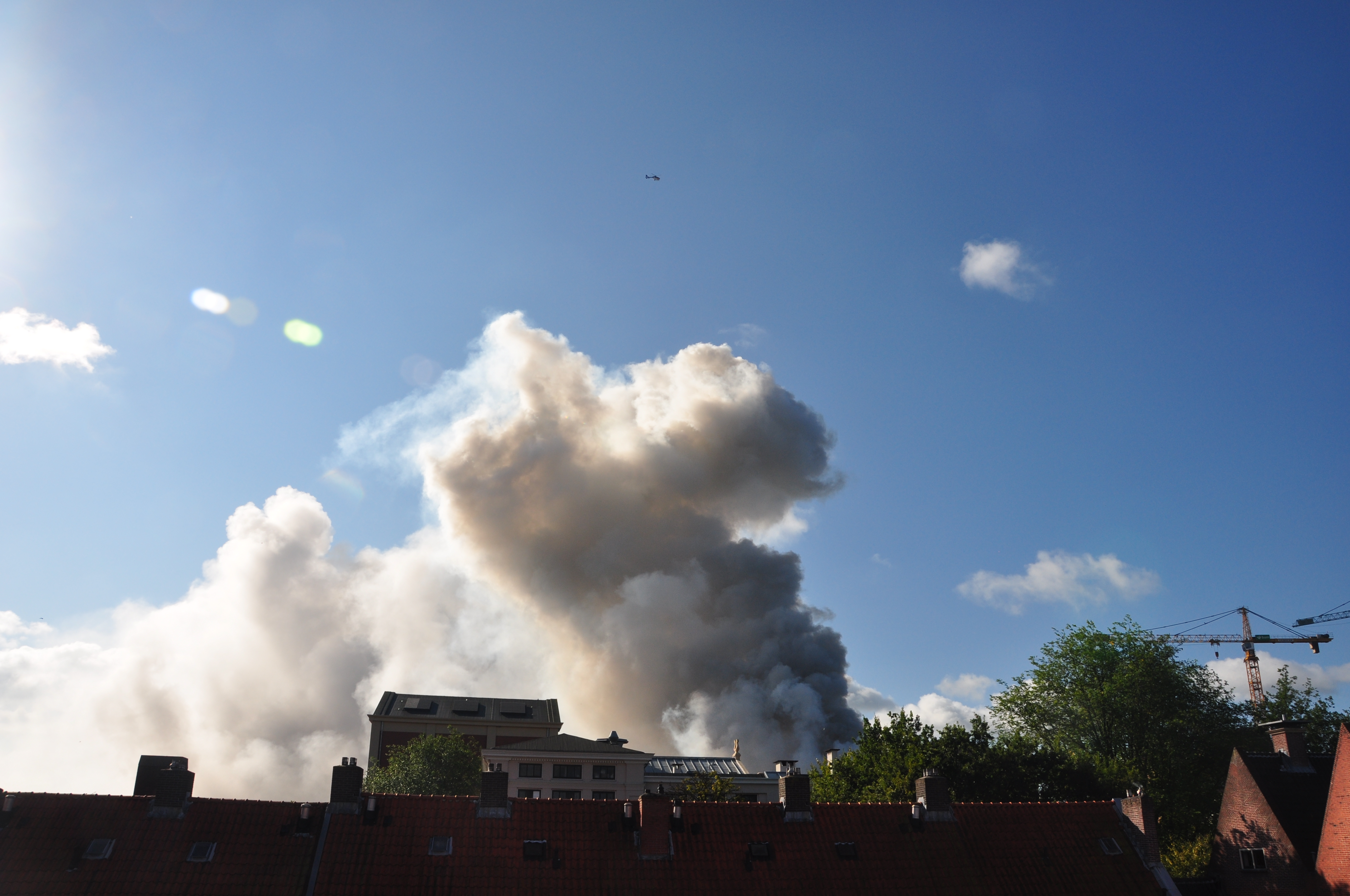 Foto: Erick Bakker - rookwolken en helikopter gezien vanuit Binnenstad-Oost