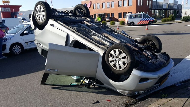 Bij de aanrijding kwam één van de twee auto’s op de kop op het wegdek terecht. De bestuurder is volgens de politie met een hoofdwond en schouderklachten afgevoerd naar het ziekenhuis.