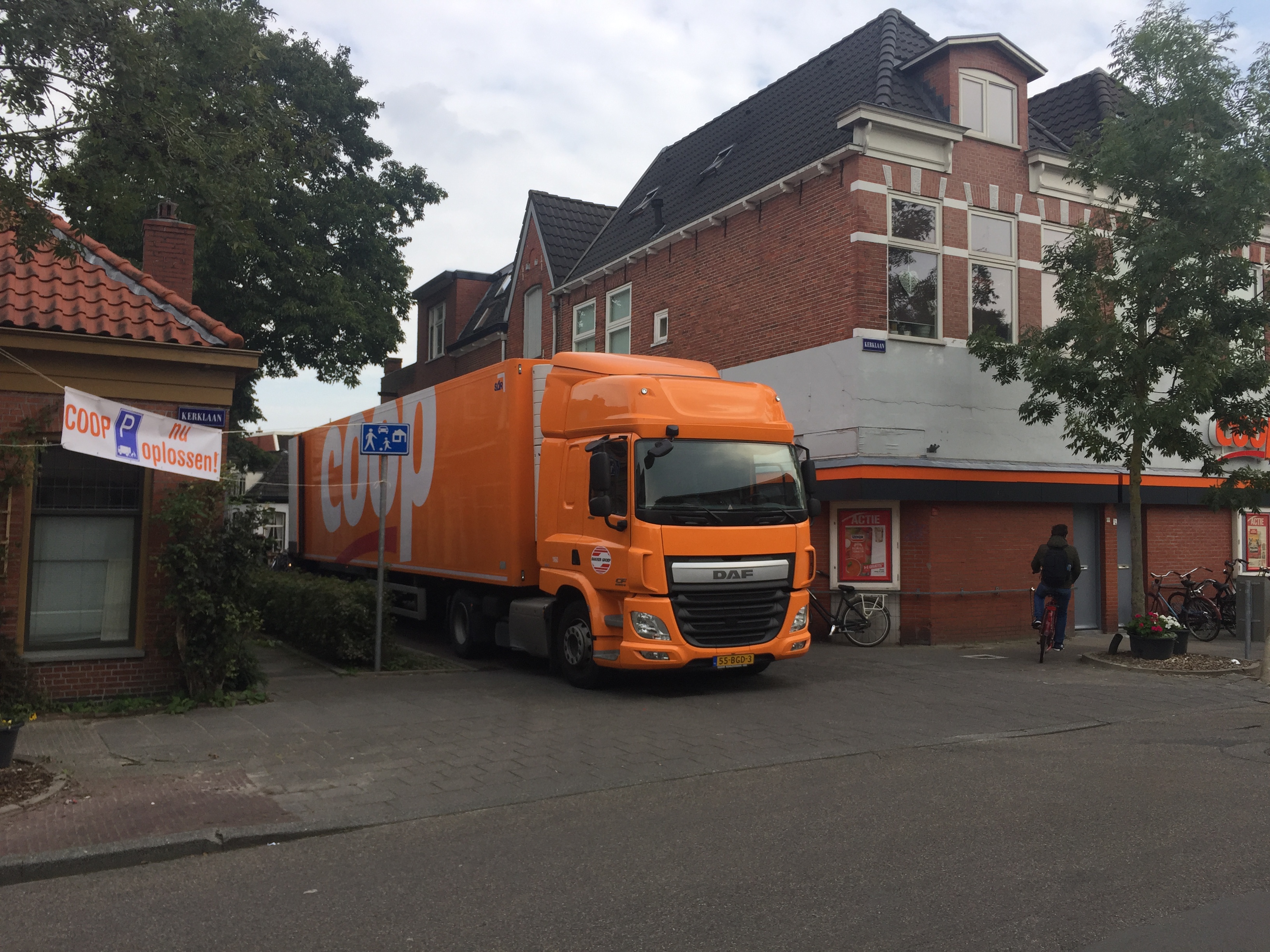 Bewoners van de Plantsoenbuurt zijn de overlast van vrachtwagens van supermarkt Coop in de Kerklaan zat. Na een online petitie werden vandaag spandoeken opgehangen door buurtbewoners.