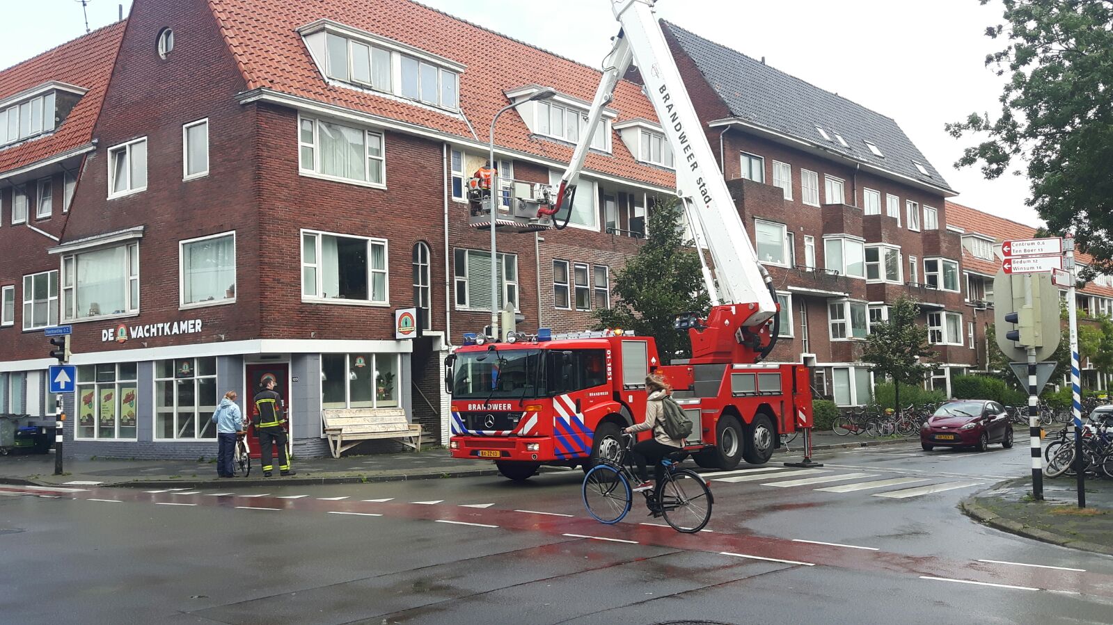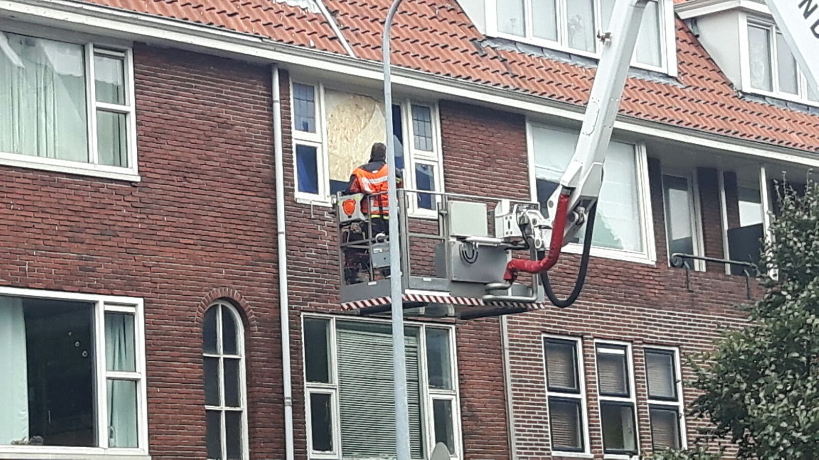 12.30: Een hoogwerker van de Groninger brandweer is in actie gekomen aan de Parkweg. Op de tweede verdieping van een woonblok is een raam kapot gewaaid.