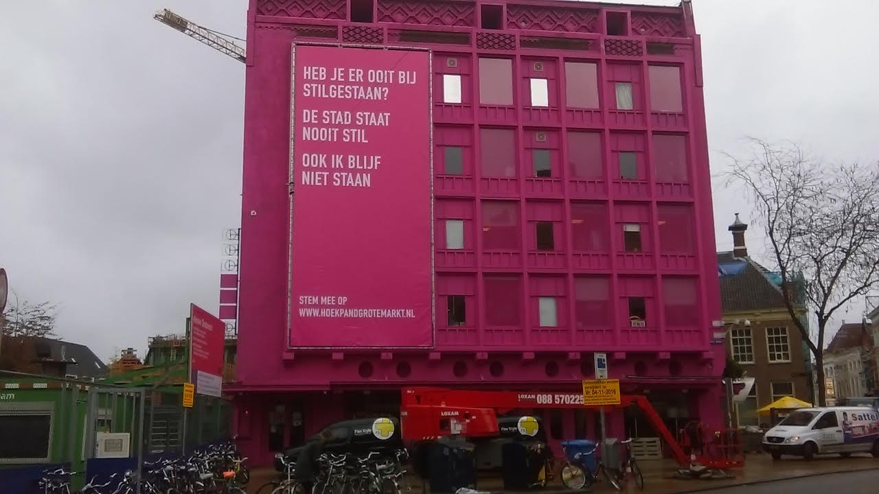 De sloop van het roze pand op de hoek van de Grote Markt en de Poelestraat begint aanstaande maandag. Dat meldt Groningen Vernieuwt. De sloop gaat ongeveer zes weken duren.