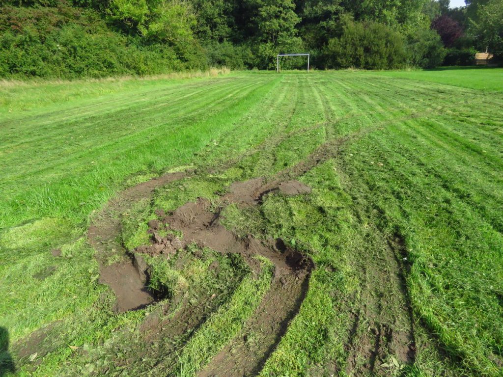 Op twitter was de afgelopen weken te lezen dat speelveldjes onbruikbaar waren door te hoog gras. Na de hevige regenval van de afgelopen week werd er wel gemaaid maar dat liet letterlijk diepe sporen na op de velden.