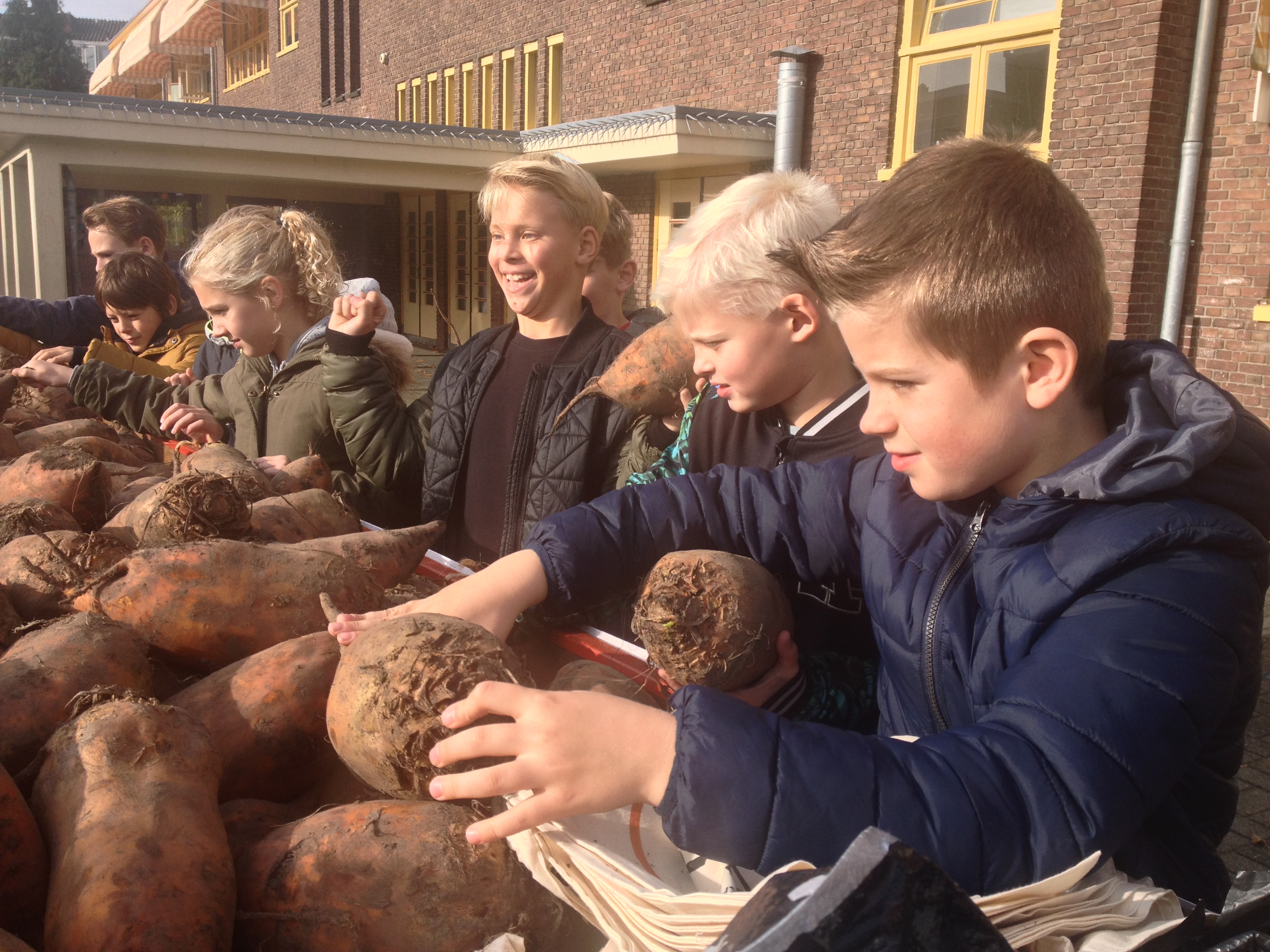 De Koninklijke Vereeniging voor Volksvermaken trekt deze dagen langs verschillende scholen in de stad om voederbieten uit te delen. “De bedoeling is dat ze hier komende week lampionnen van gaan maken.”
