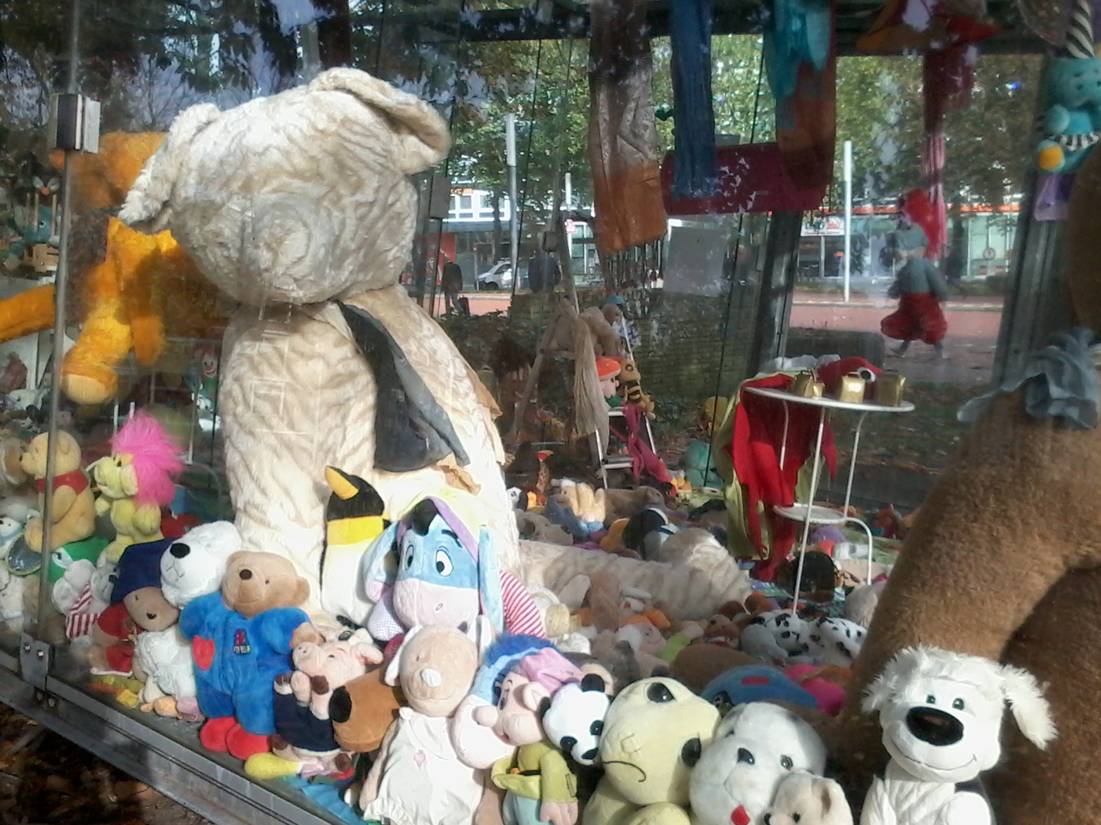 De grote teddybeer die deel uitmaakt van een tentoonstelling van de kunstenaar Charlemagne Palestine in het Tschumipaviljoen aan het Hereplein is terecht.