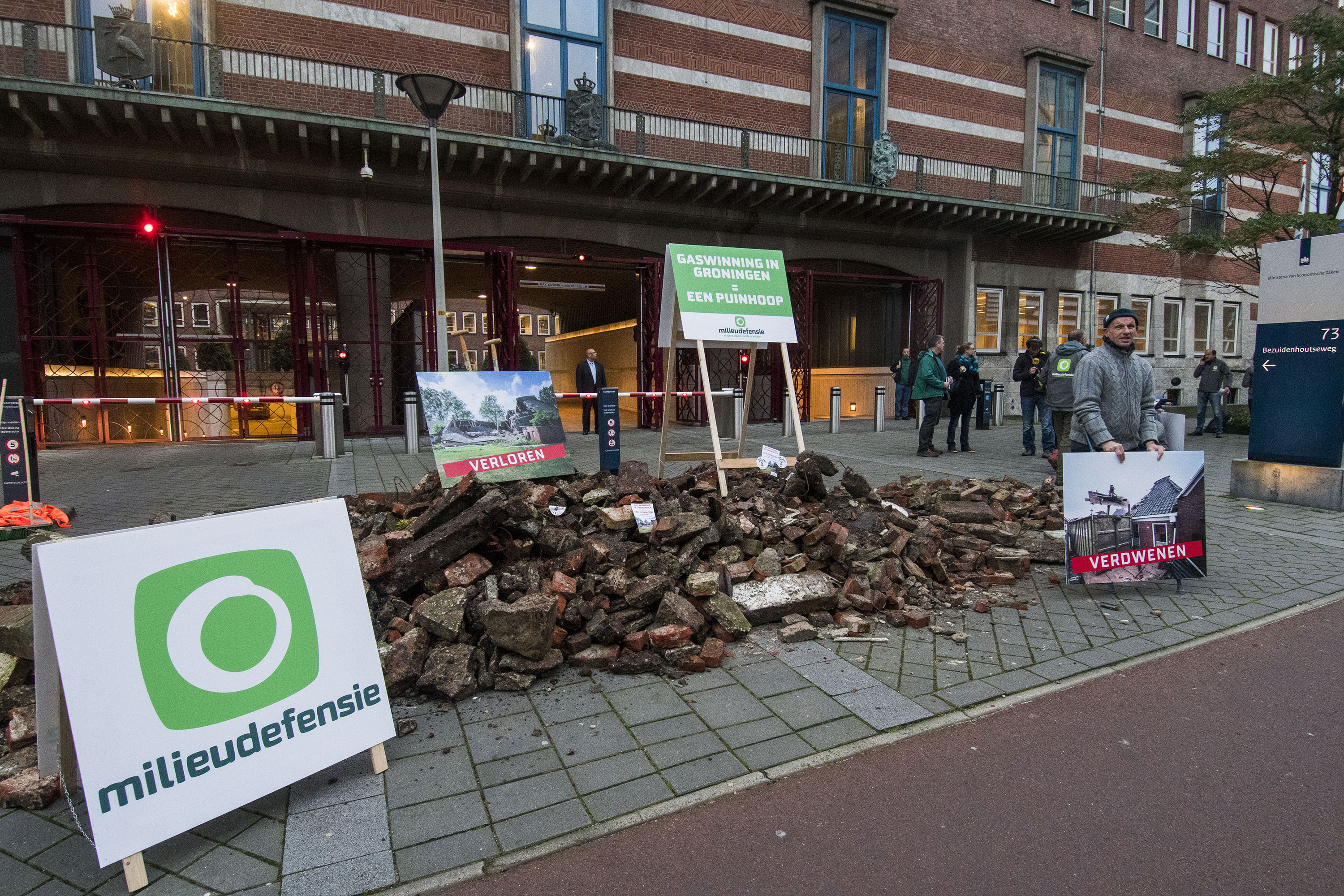Gedupeerde Groningers en Milieudefensie hebben donderdagmorgen 10 kuub puin gestort op de stoep van het ministerie van Economische Zaken in Den Haag. Het gaat om puin van door de gaswinning vernielde monumentale boerderijen.
