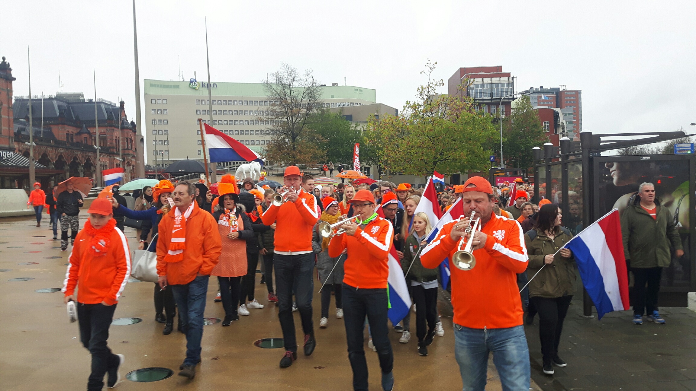 Foto Lars de Leeuw. Fans gaan in de Oranjeparade naar het FC Groningen stadion.