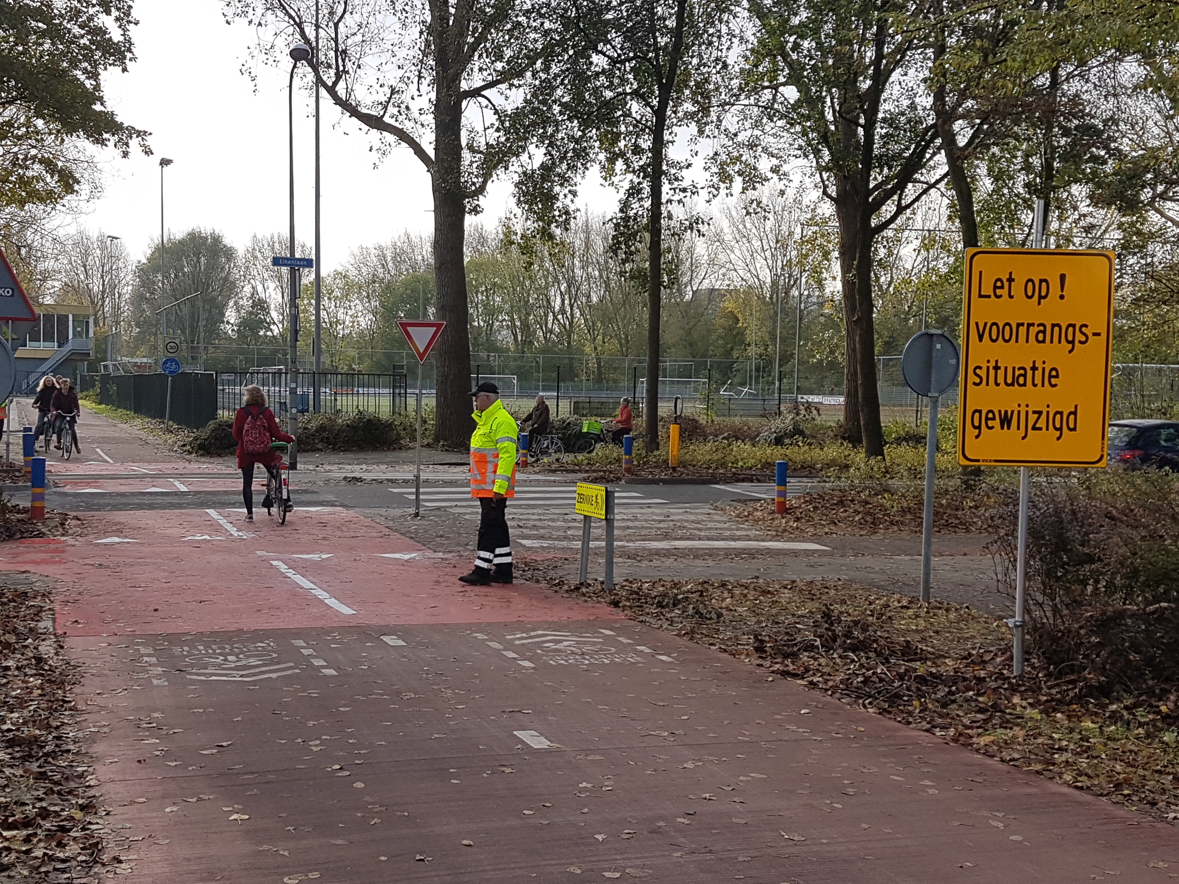 Het was even wennen maandagochtend bij de kruising op de Eikenlaan. Het was vandaag de eerste dag na de herfstvakantie dat de situatie gewijzigd is.