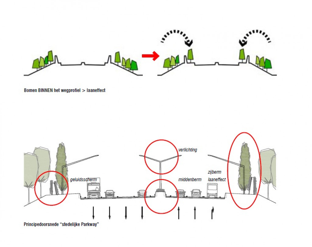Ook vanuit de wijken gezien krijgt de weg een groene aanblik. Bij de meeste wegen staan de bomen achter de geluidsschermen, maar bij de nieuwe zuidelijke ringweg komen ze ervoor.
