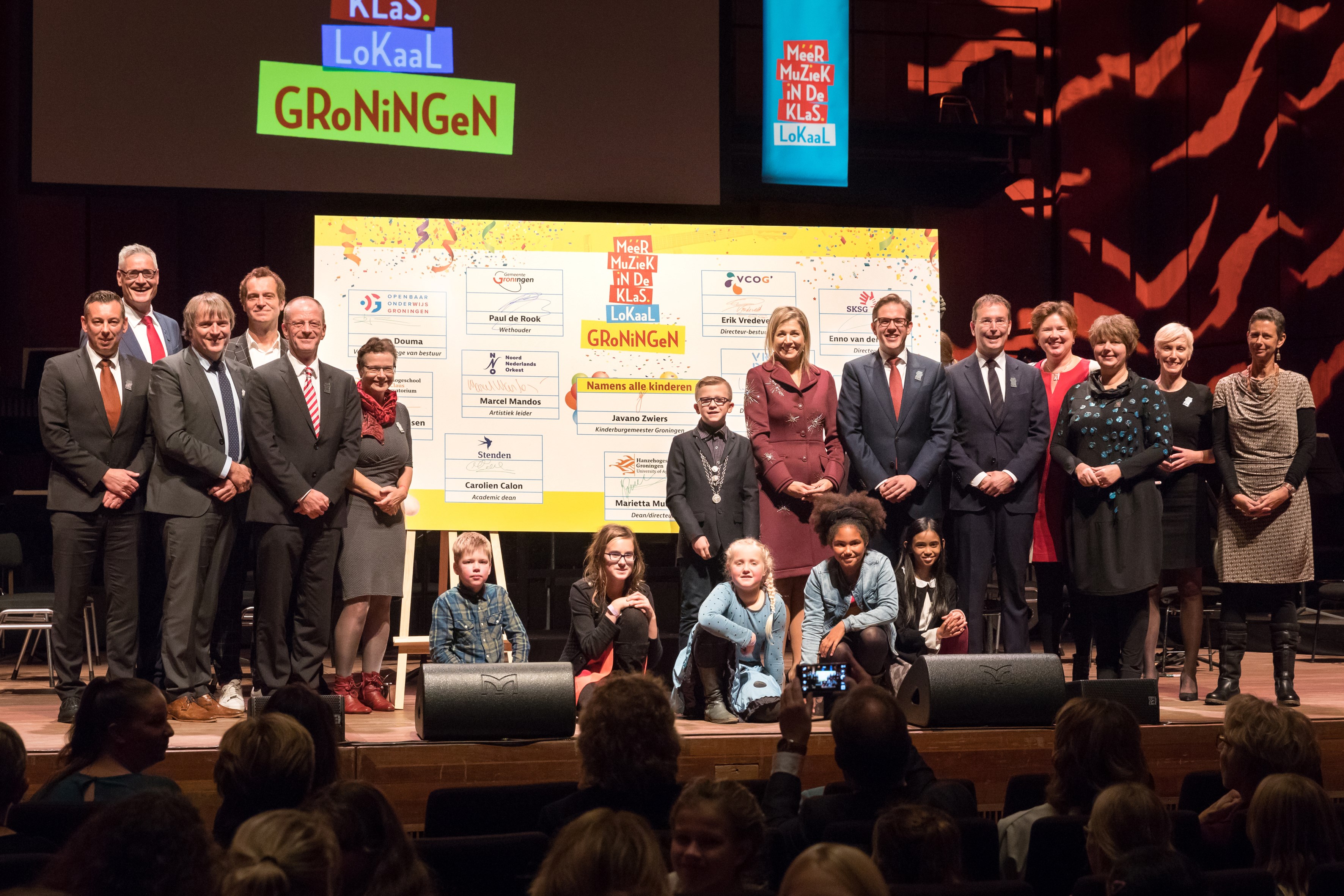 Koningin Máxima bracht dinsdagmiddag een bezoek aan de Oosterpoort. De koningin was daar als erevoorzitter om het project ‘Méér Muziek in de Klas’ te beklinken. Negen partijen kwamen overeen dat in 2020 ieder kind in de stad muziekonderwijs krijgt.