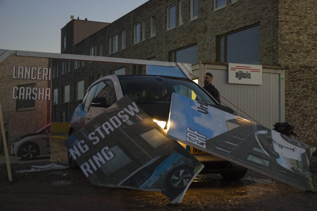 Door met een auto aan de Flamengostraat door een muur van piepschuim te rijden werd donderdagmiddag het project “Stadswerf Carsharing” gestart.