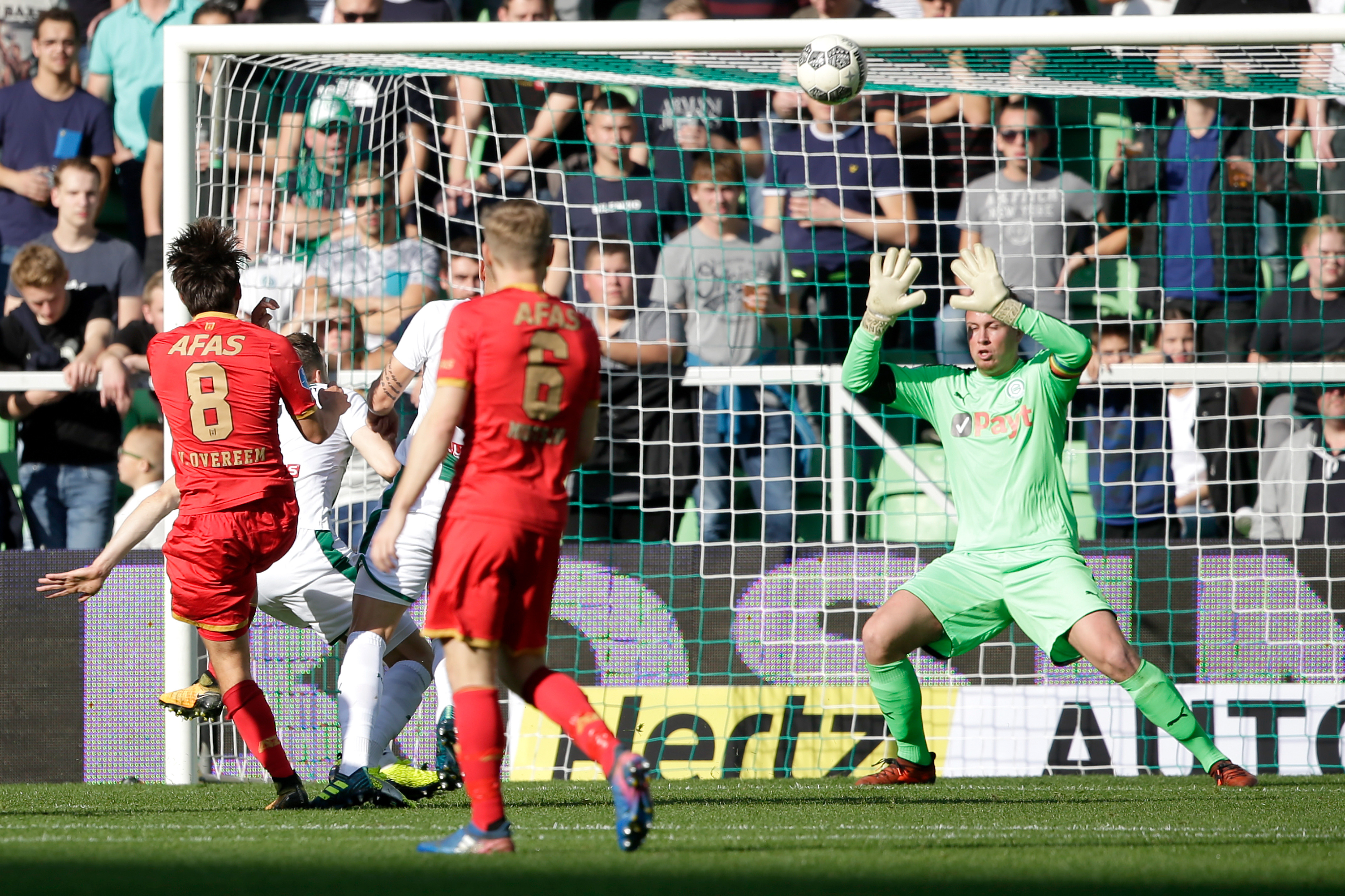 Foto: Sportphotoagency.com Joris van Overeem van AZ stuit op Sergio Padt van FC Groningen