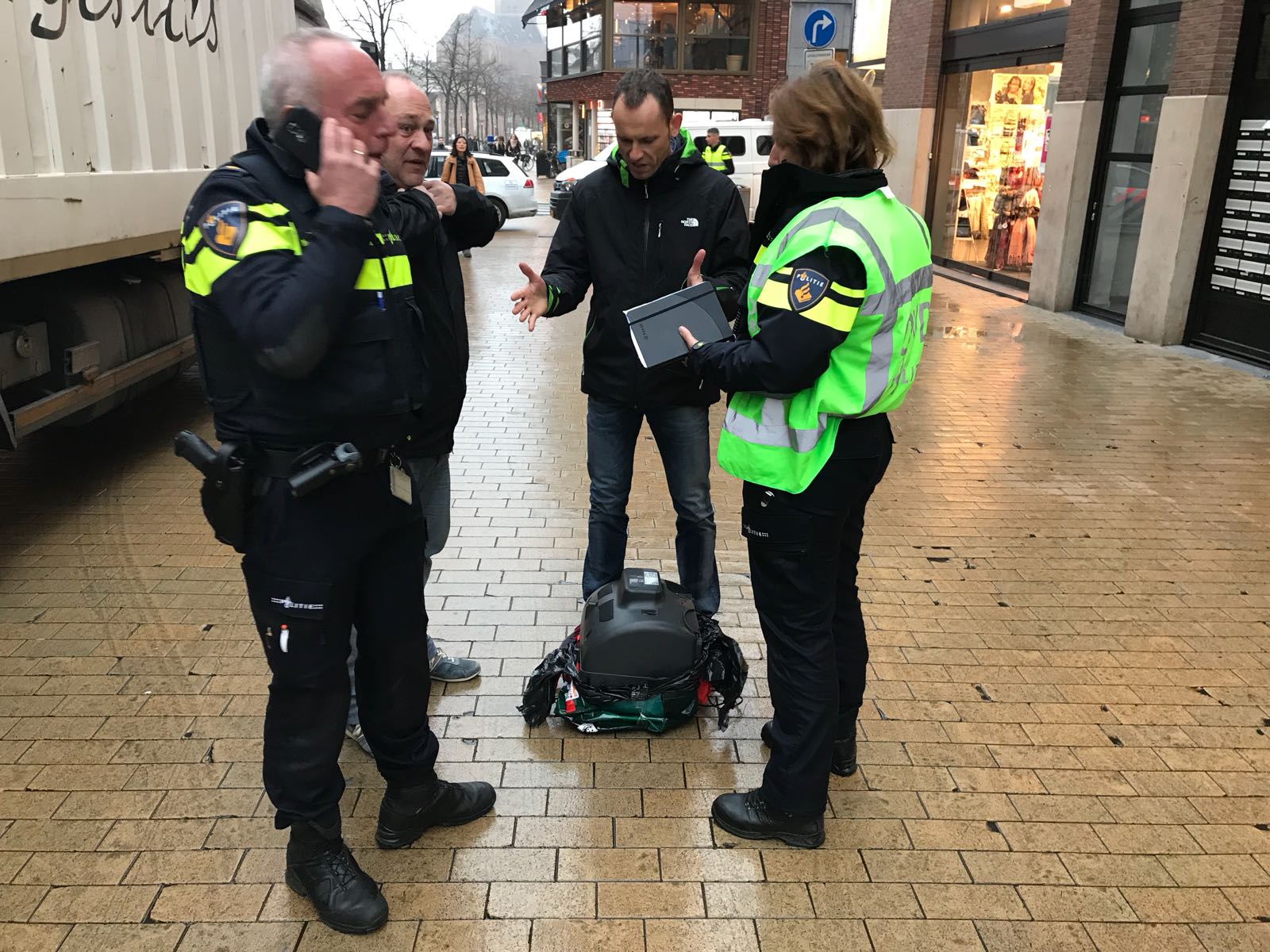 Iemand heeft zijn tas laten staan? Studentengrap? (daar is het nog wel wat vroeg voor :p). De politie staat wel gezellig te keuvelen binnen de afzetting, dus zo te zien verwachten er ook niet al te veel van.