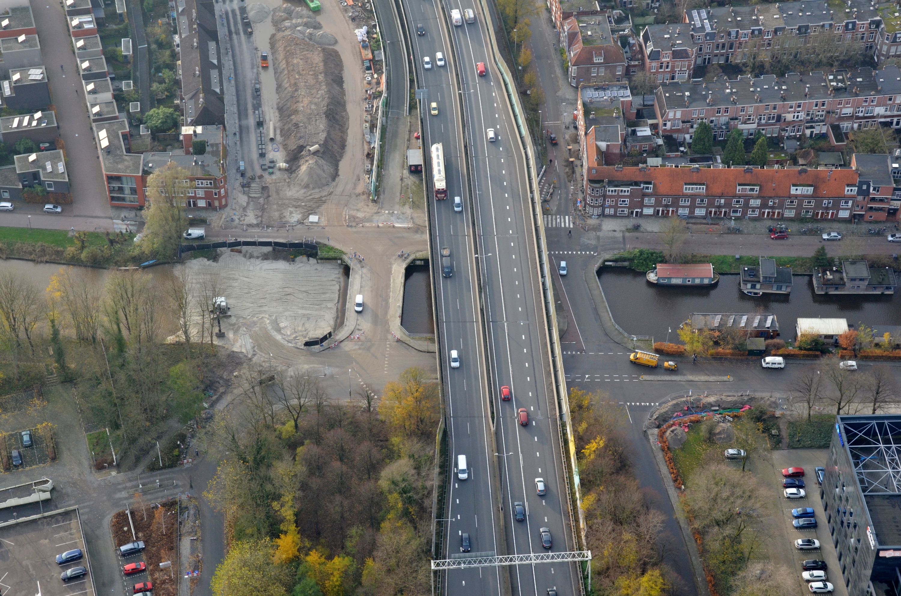Aan de overzijde van het water, in de rijbaan van het Winschoterdiep, zijn de rioleringswerkzaamheden uitgesteld tot begin volgend jaar, vanwege het natte weer.