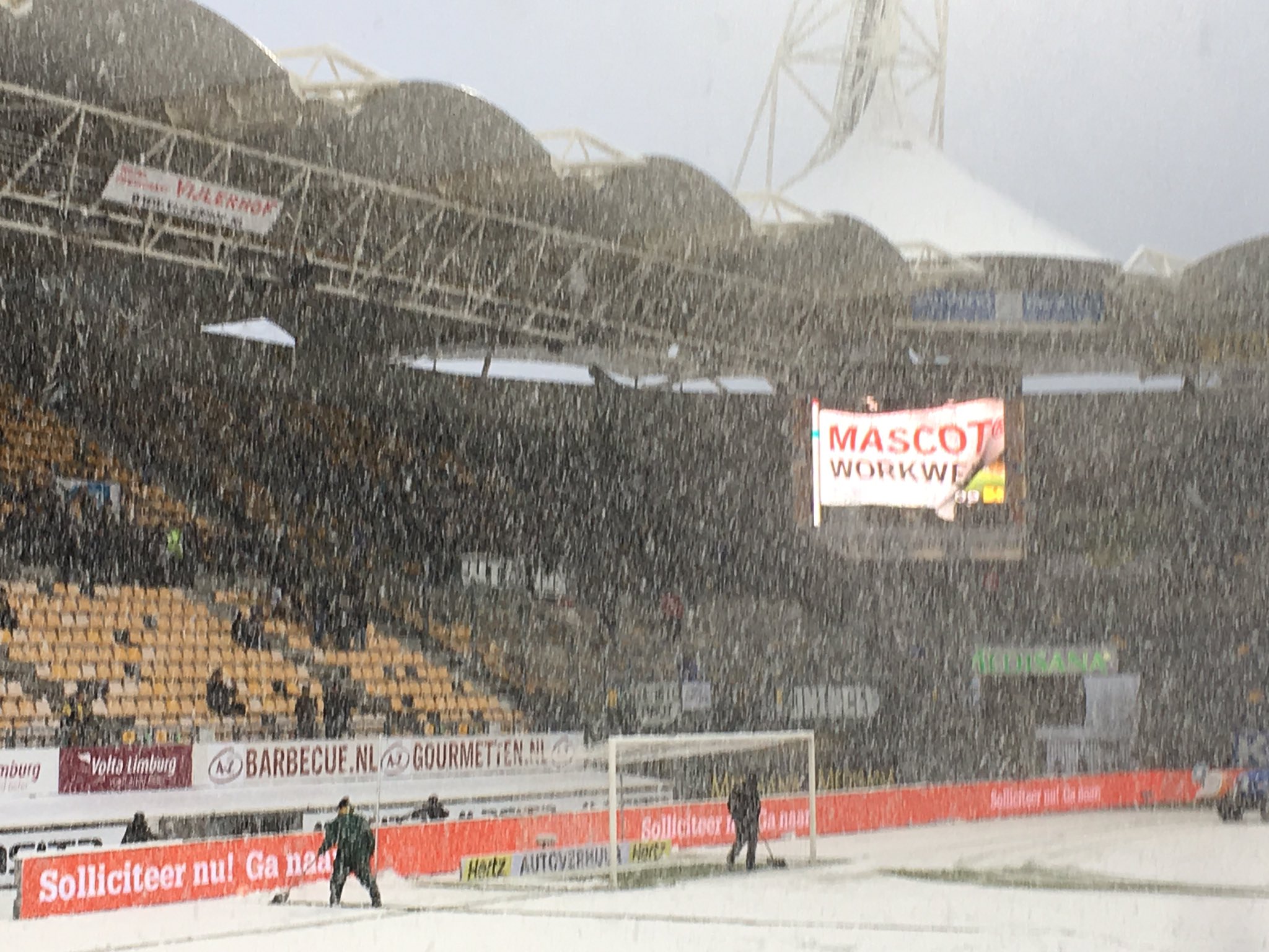 In het stadion van Roda JC in Kerkrade werd zondagochtend met man en macht gewerkt om het veld voor het duel tegen FC Groningen speelklaar te krijgen. Om 12.30 uur werd ‘gewoon’ afgetrapt.