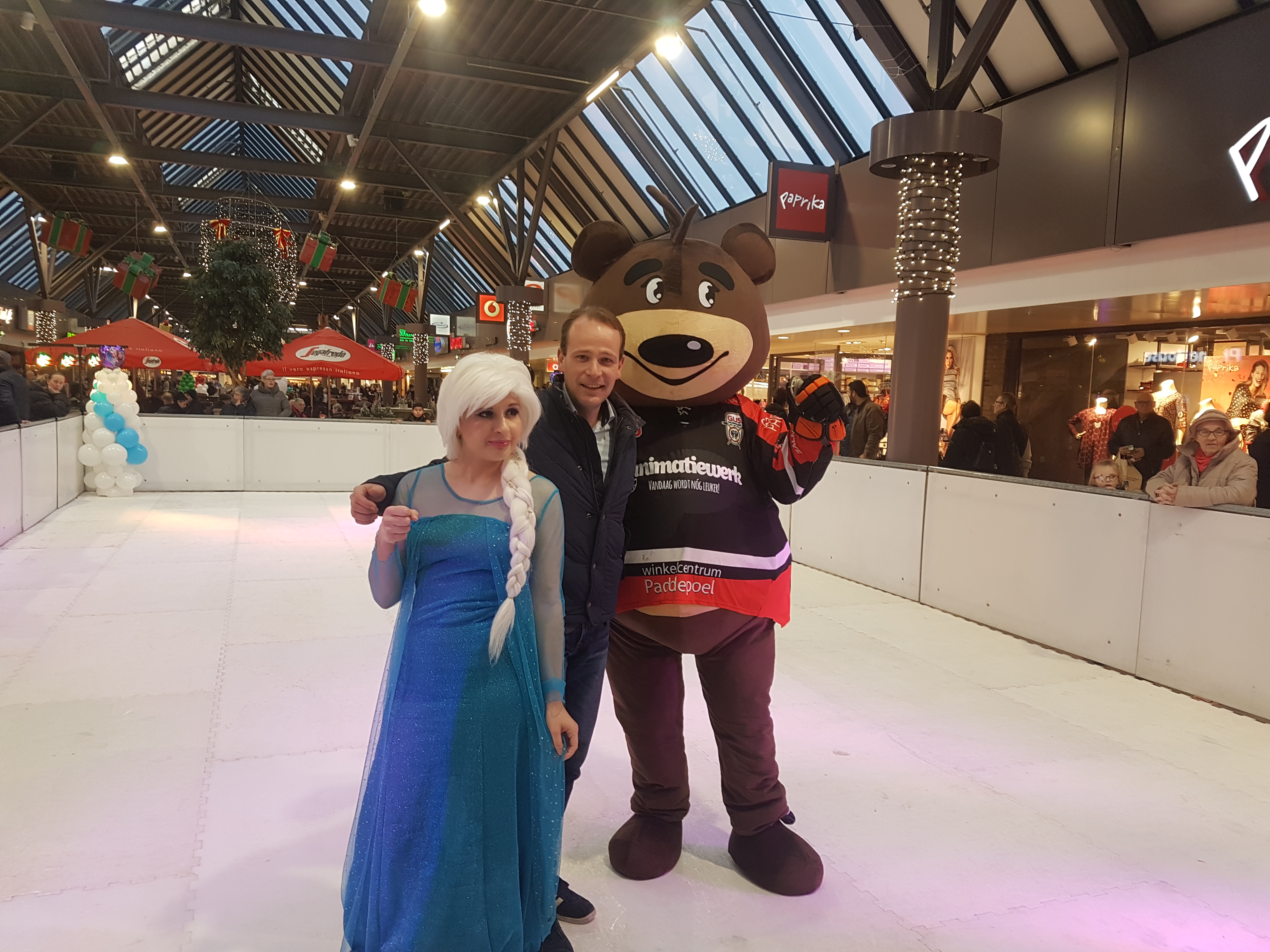 Winkelcentrum Paddepoel was vrijdagmiddag in kerstsfeer. Een ijsbaan werd feestelijk geopend door wethouder Joost van Keulen en Elza uit Frozen.