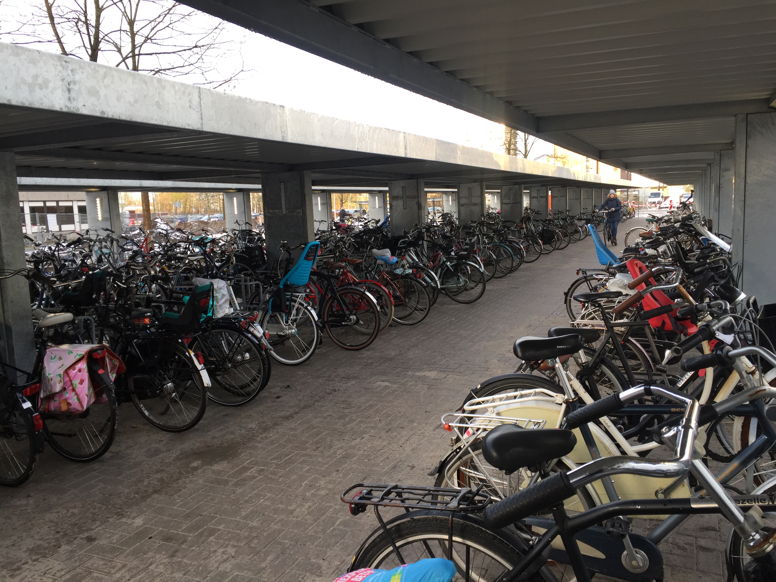 De overkapte fietsenstalling op het voorplein biedt ruimte aan 450 fietsen. Er zijn twintig plaatsen voor fietsen met een krat en ook twintig oplaadpunten voor elektrische fietsen.