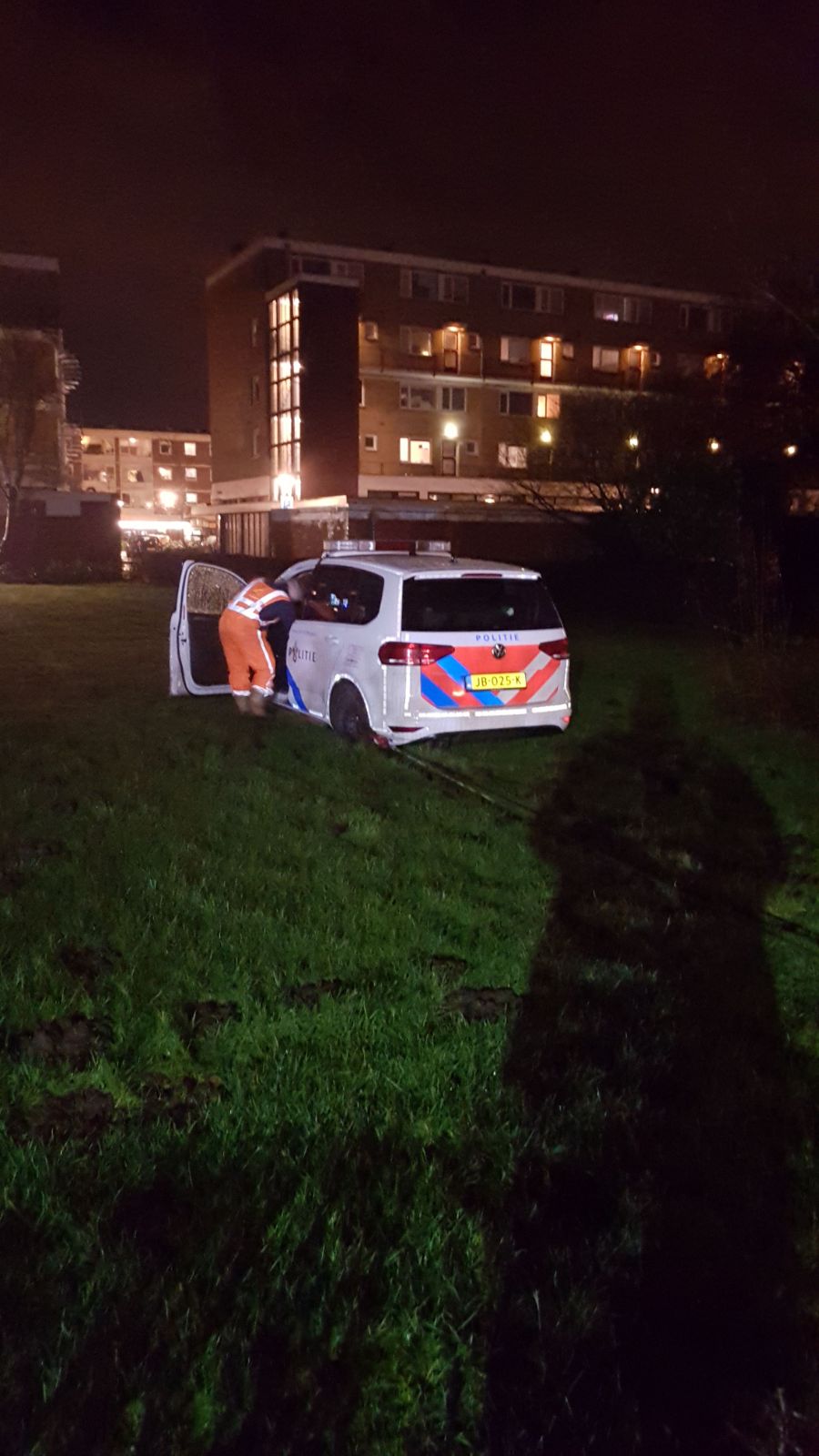 Bij dezelfde achtervolging kwam een politieauto vast te zitten in de modder. Agenten reden met hun voertuig over een grasveld toen de wagen op een gegeven moment tot de assen wegzakte. Een bergingsbedrijf heeft zowel de politiewagen als de gecrashte auto geborgen. Waarom de automobilist op de vlucht was is onbekend.