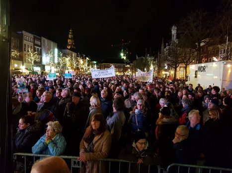 De Vismarkt is vrijdagavond volgestroomd met actievoerders die demonstreren tegen de aardgaswinning die de aardbevingen in de provincie Groningen veroorzaken. Er zijn waarschijnlijk meer dan tienduizend demonstranten.