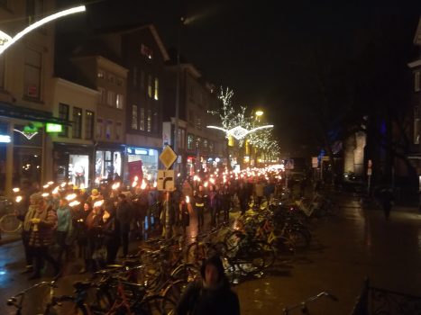 De demonstranten liepen vanaf de Vismarkt in optocht door de Groninger binnenstad. Dat gebeurde eerder dan gepland, omdat de Vismarkt propvol stond met mensen.