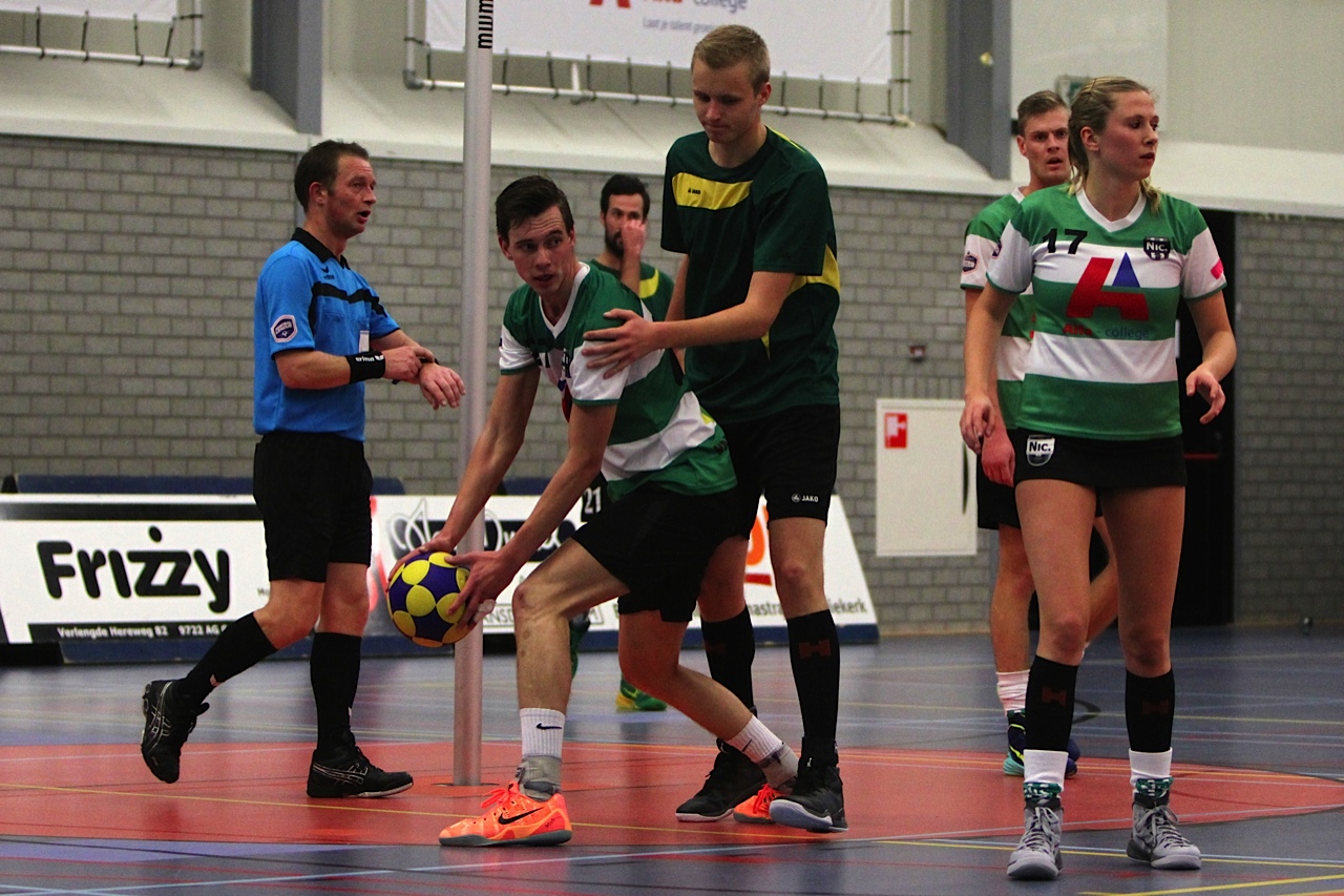Nic. begon goed aan de wedstrijd. Dankzij doelpunten van Sven Müller, Roos Verheugt en Gerben Boonstra komen de Groningers snel op een 3 – 0 voorsprong. Nic. is op het veld de baas en van 3 – 1 loopt men uit naar 7 – 2. Dat is het moment dat Groen Geel wakker wordt. De korfballers uit Wormer stomen op en acht minuten voor het rustsignaal is het 7 – 6 geworden. Ricky Wu had op dat moment al een aantal doelpogingen gedaan echter zonder resultaat. Met de hete adem van de korfballers uit de Zaanstreek in de nek lukt het wel, en tekent de Taiwanees voor de 10 – 8. De ruststand wordt uiteindelijk bepaald op 12 – 10.
