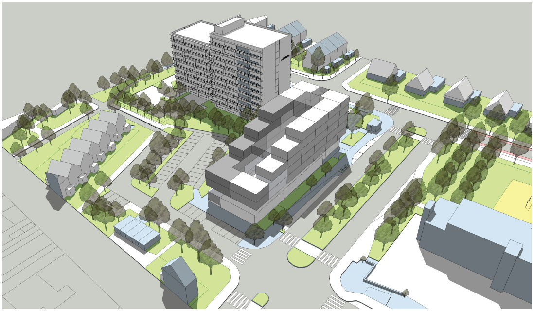 Aan De Merodelaan in de Wijert Zuid is het plan de huidige supermarkt te vervangen door een nieuwe supermarkt en daarboven rond de 55 nieuwe appartementen te bouwen.