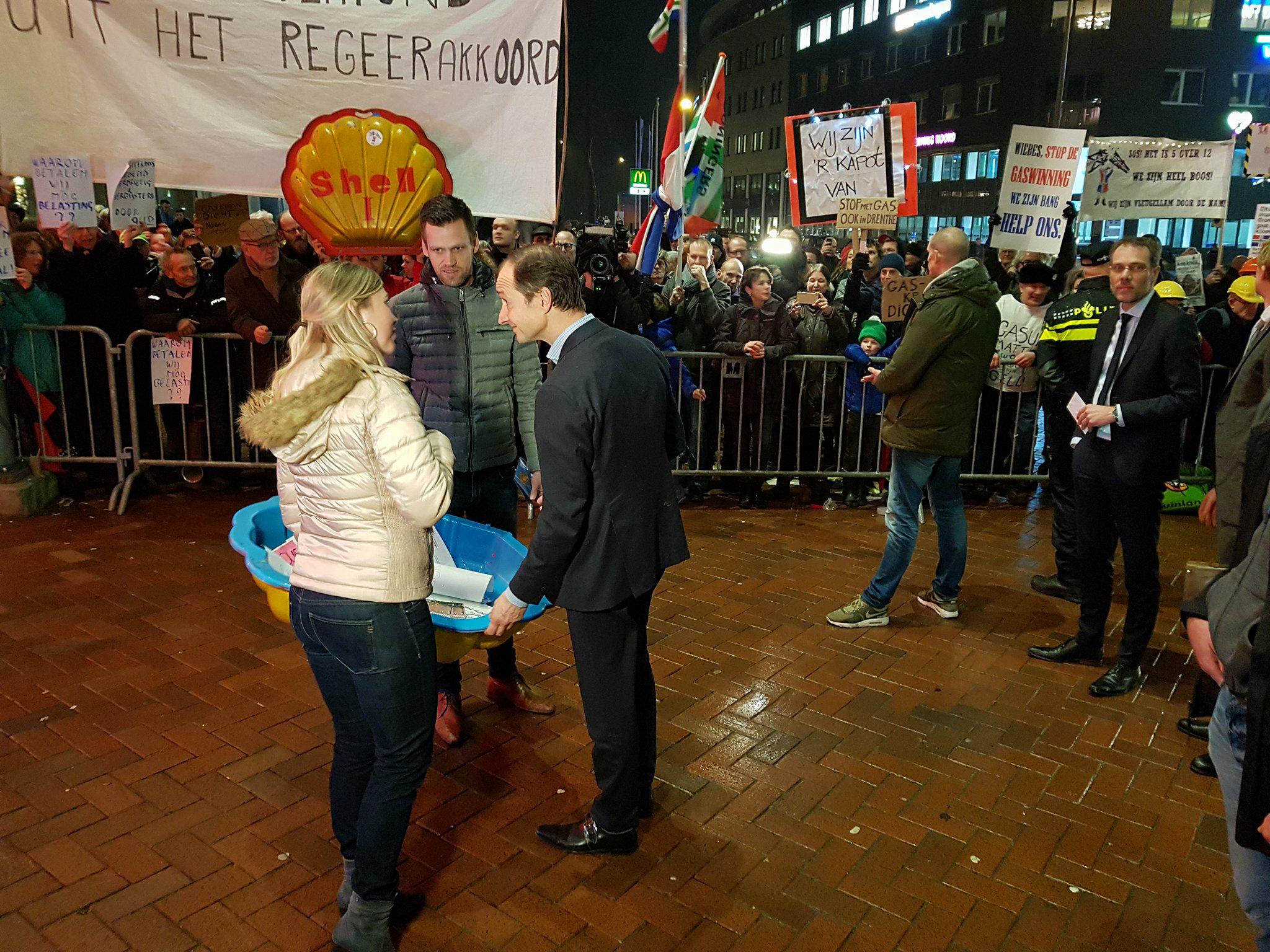 Op Facebook werd maandag een actie gestart waarin actievoerders oproepen om tijdens het bezoek van minister Wiebes te protesteren tegen de gaswinning en de gevolgen daarvan. Zo’n 200 mensen verzamelden zich aan het einde van de middag voor Martiniplaza.
