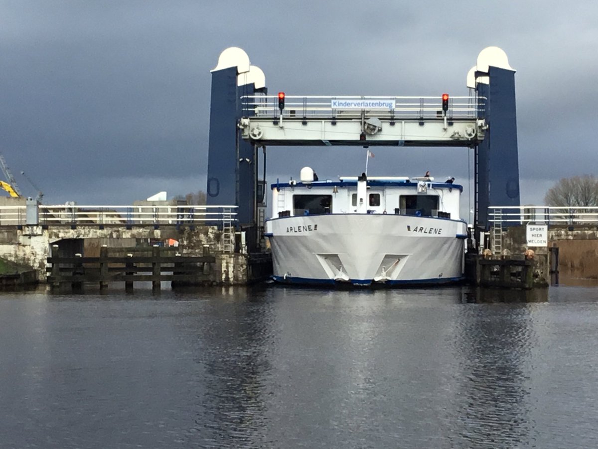 Op de foto van de Inspectie Scheepvaart passeert De Arlene hier de Kinderverlatenbrug bij Hoogkerk.