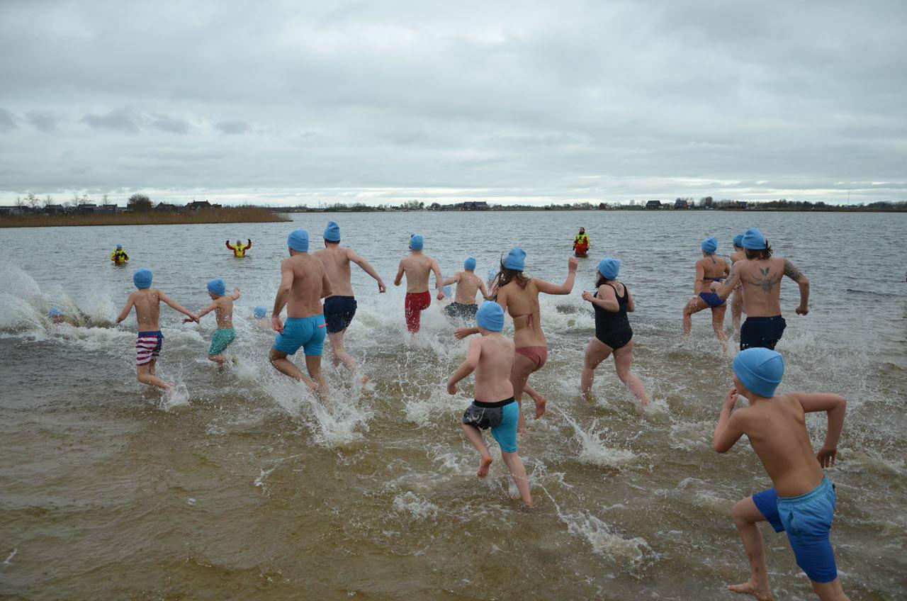 De nieuwjaarsduik bij het vorig jaar aangelegde strand Meeroevers in de wijk Meerstad trok zaterdagmiddag tientallen zwemmers.