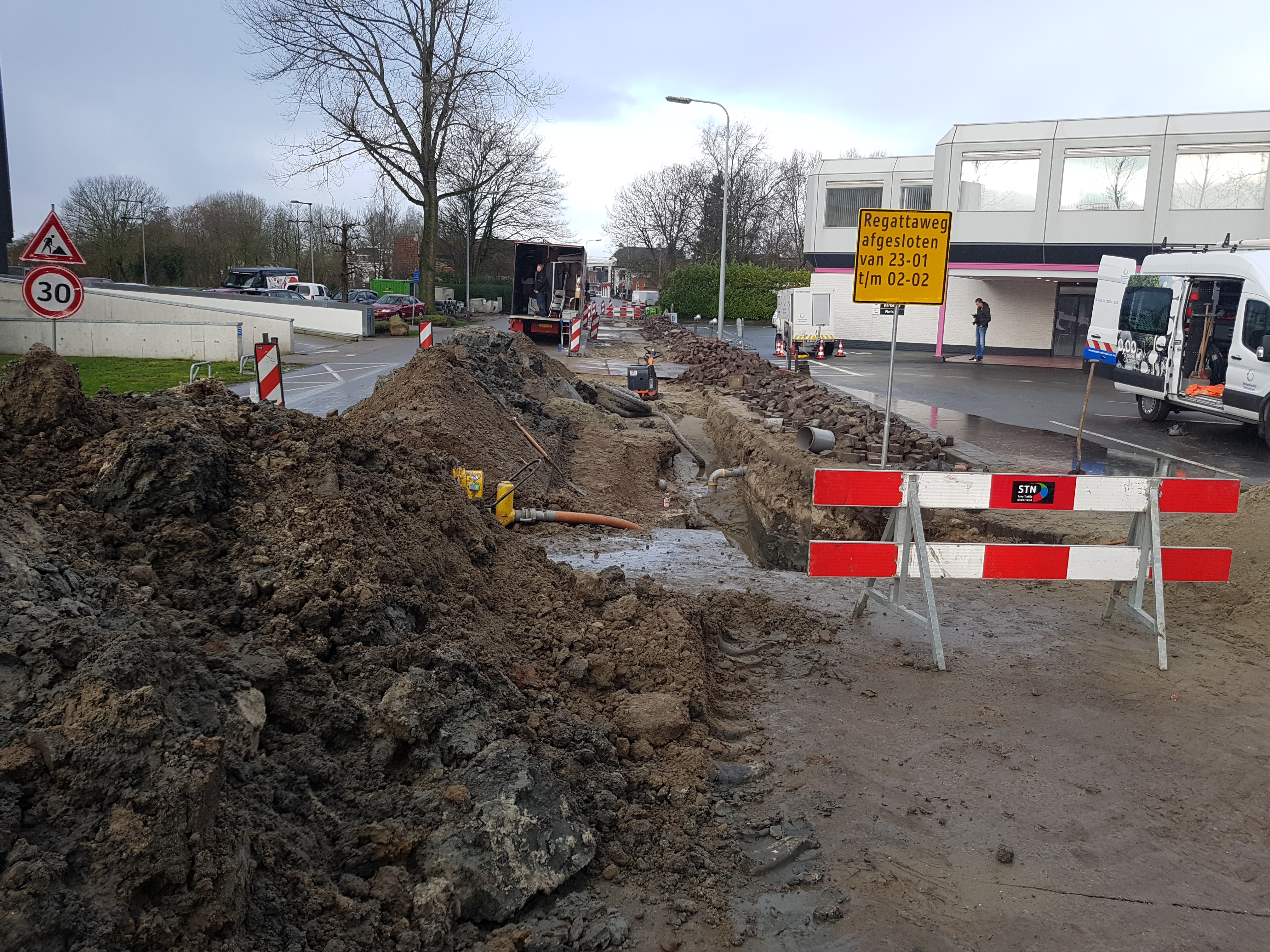 Vrijdagochtend werd bij herstelwerkzaamheden van een riool een waterleiding kapot getrokken. Om de omwonenden toch van water te voorzien werd een waterwagen naar de Regattaweg gestuurd.
