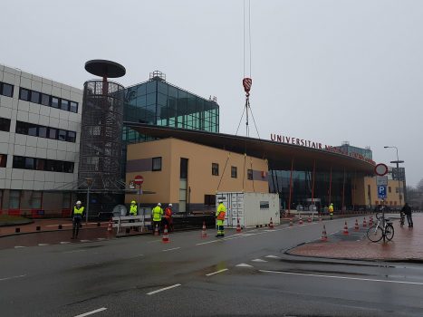 Een enorme kraan takelde dit weekend twaalf zeecontainers uit het hart van het UMCG. Deze containers waren nodig om als verhoging te dienen voor een andere kleinere kraan. Deze was nodig om een liftschacht te bouwen achter de “radar” van het UMCG.