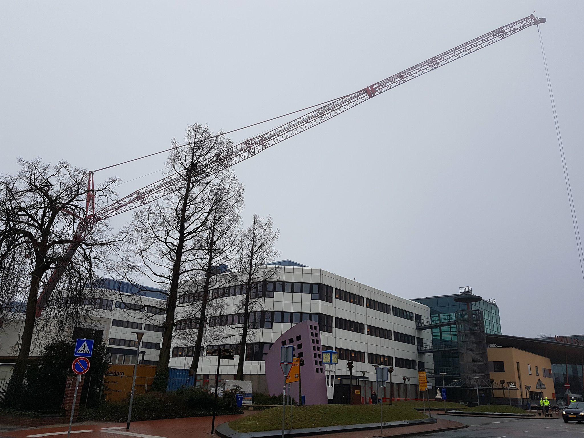 Een enorme kraan takelde dit weekend twaalf zeecontainers uit het hart van het UMCG. Deze containers waren nodig om als verhoging te dienen voor een andere kleinere kraan. Deze was nodig om een liftschacht te bouwen achter de “radar” van het UMCG.