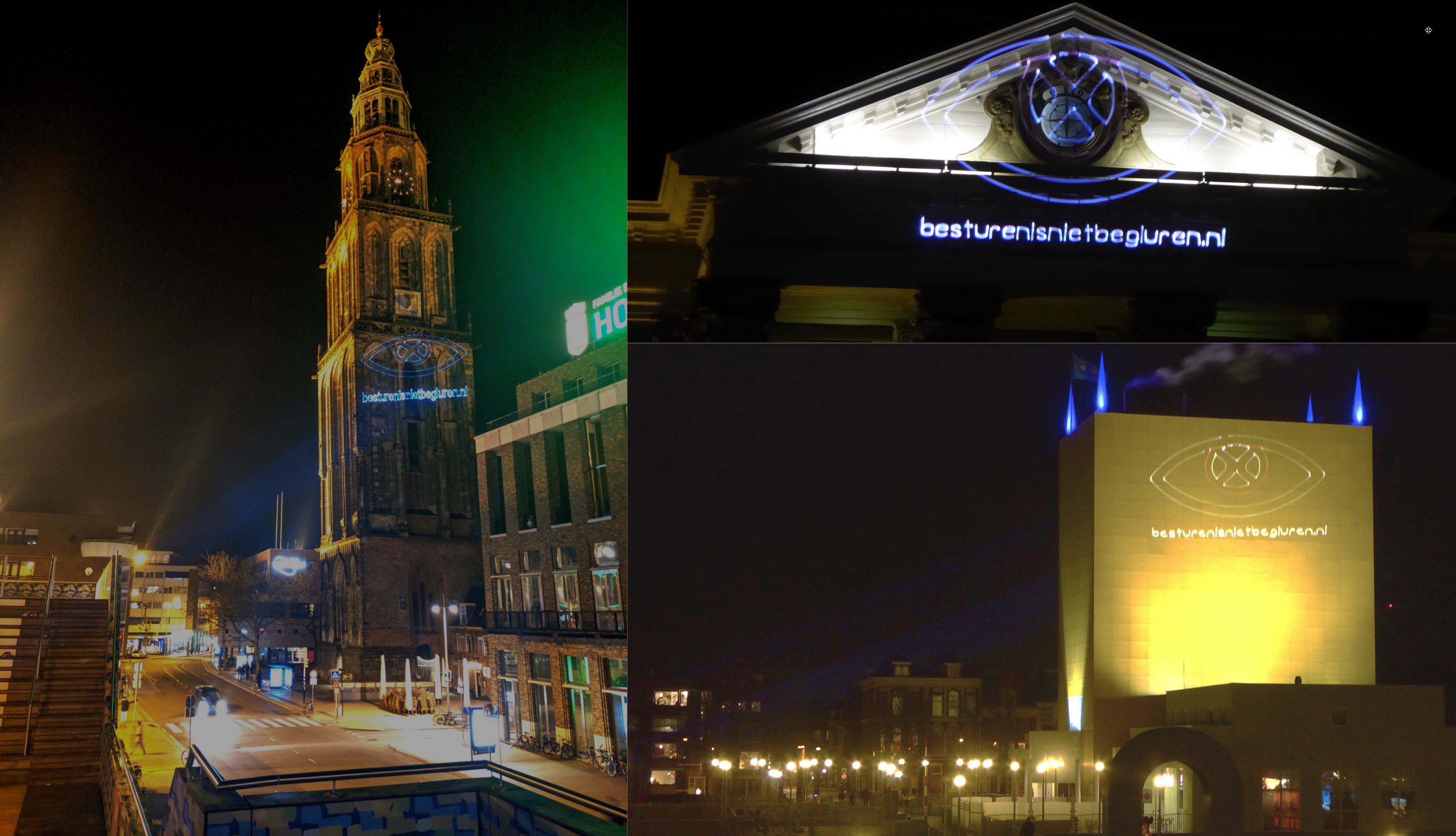 Dinsdagavond was er een oog met de tekst “besturenisnietbegluren.nl” te zien op de Martinitoren, het stadhuis en het Groninger Museum, een actie van ROOD.