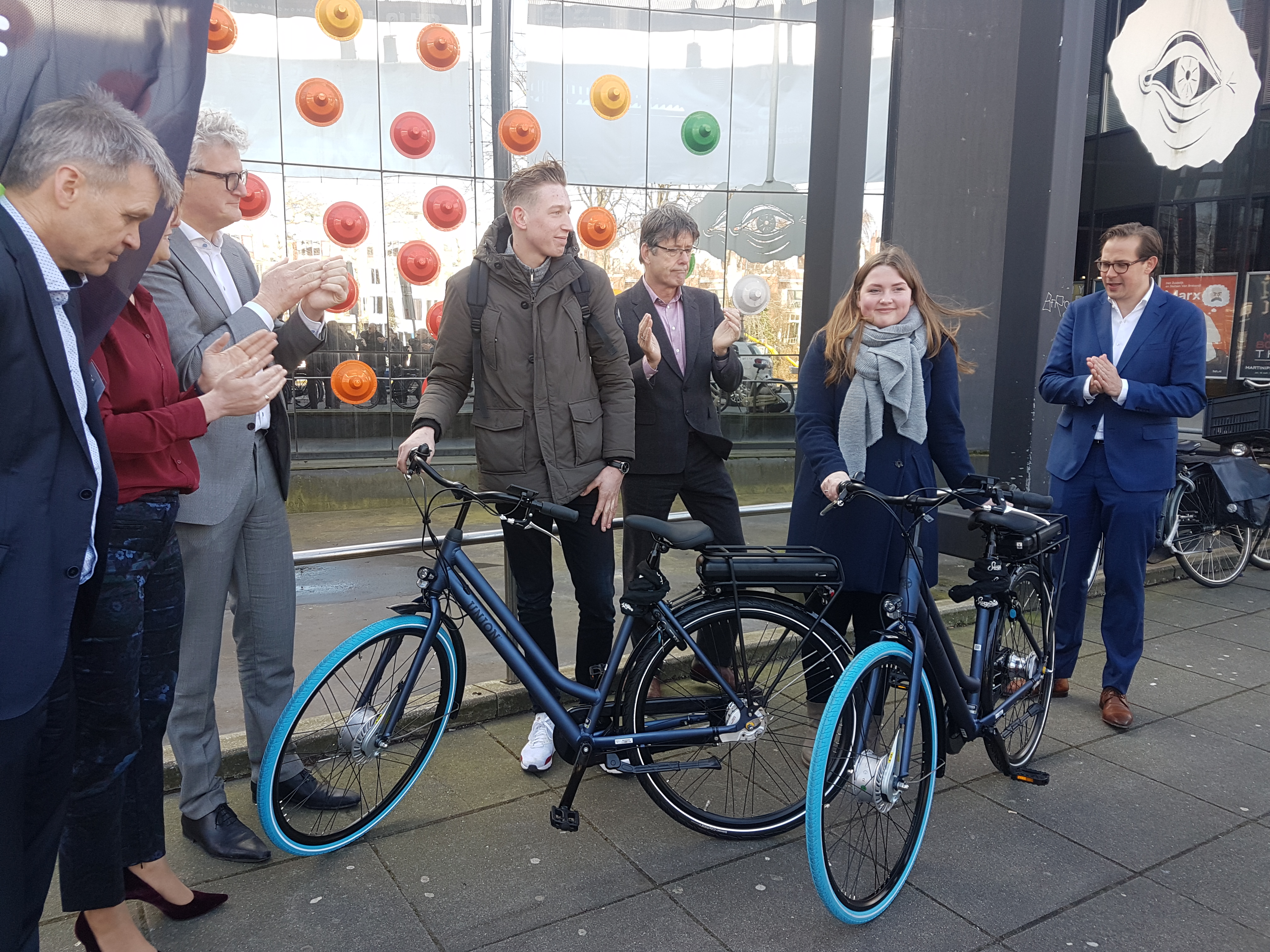 De eerste twee e-bikes werden uitgedeeld door Paul de Rook, volgens de wethouder wordt het openbaar vervoer alleen maar drukker door de aanpak van de ring.