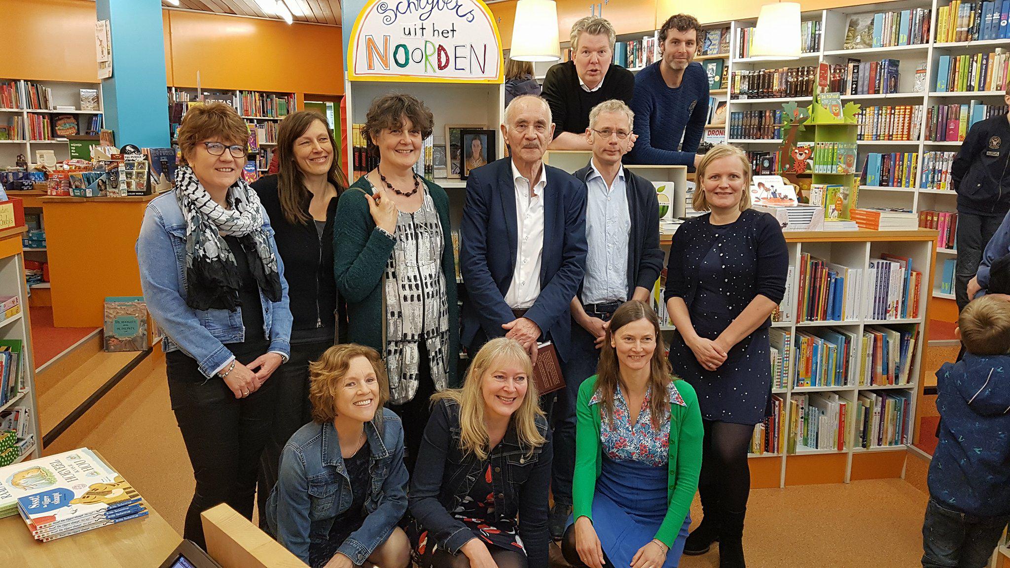 De schrijvers Christien Boomsma, Marike Goslinga, Fabien van der Ham, Mies van Hout, Gonneke Huizing, Harm de Jonge, Mariken Jongman, Corien Oranje, Annejoke Smids, Tjibbe Veldkamp en David Vlietstra staan met hun boeken in de kinderboekenkast. Daarnaast schreven ze gezamenlijk een verhaal dat vanmorgen werd voorgelezen. Behalve Christien Boomsma waren alle schrijvers aanwezig.
